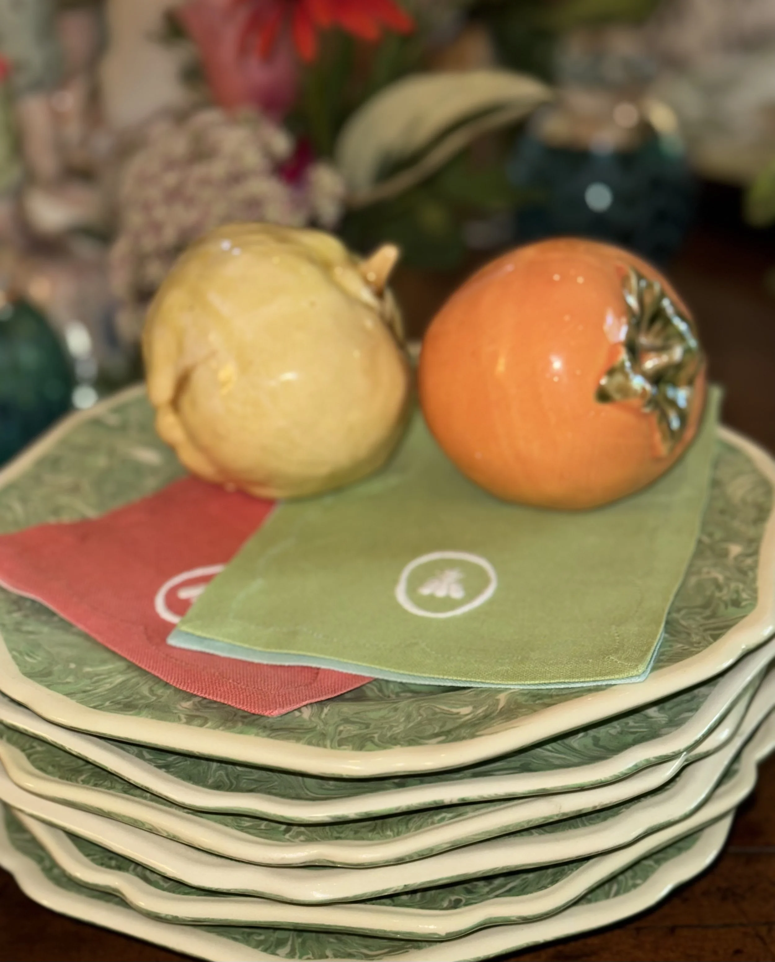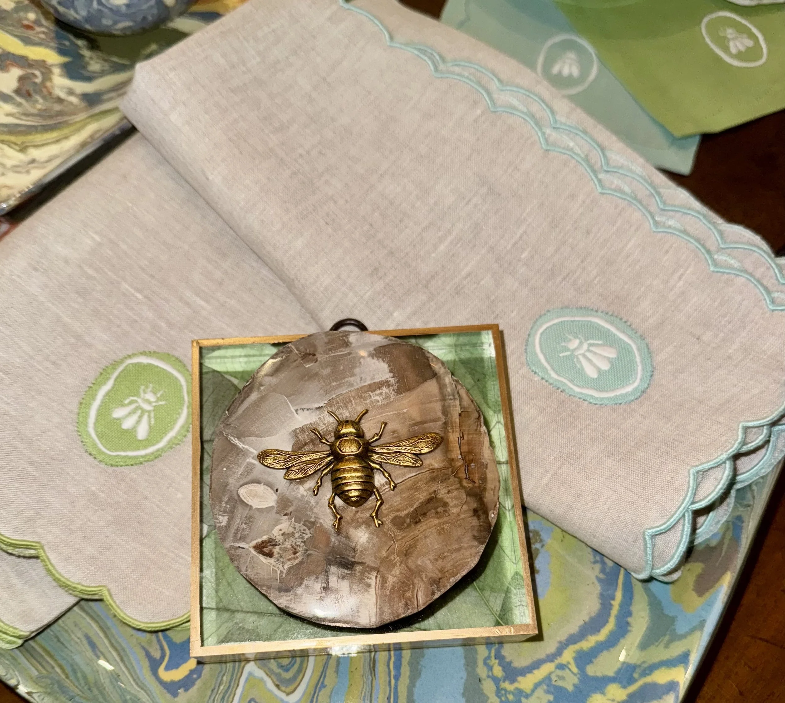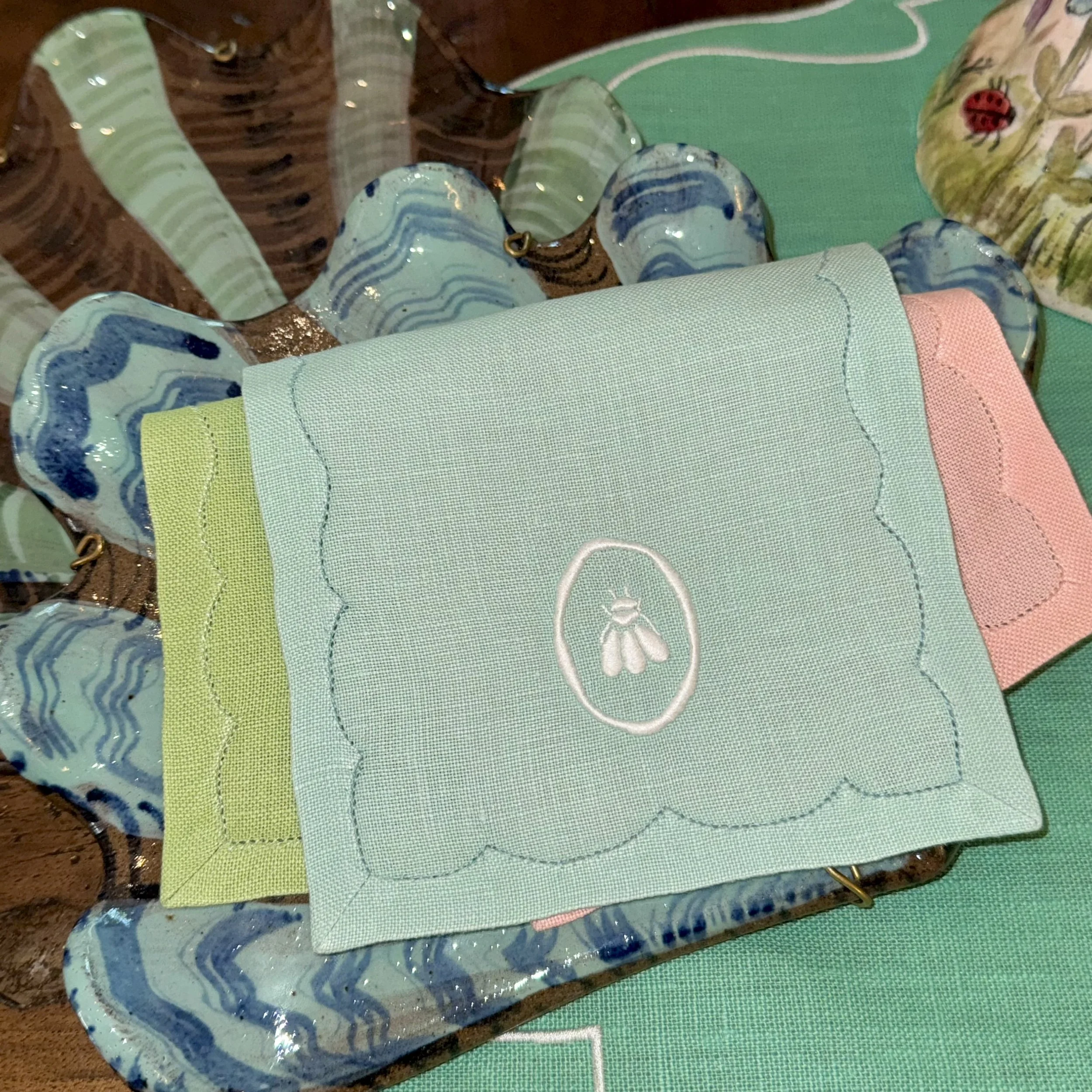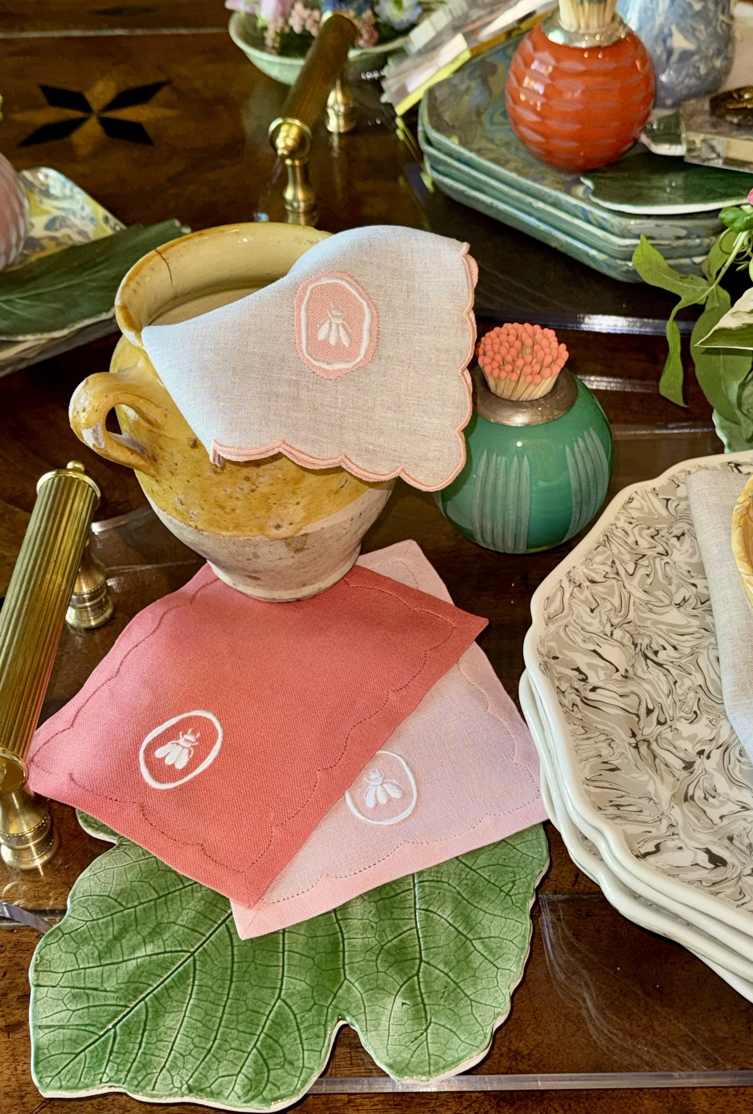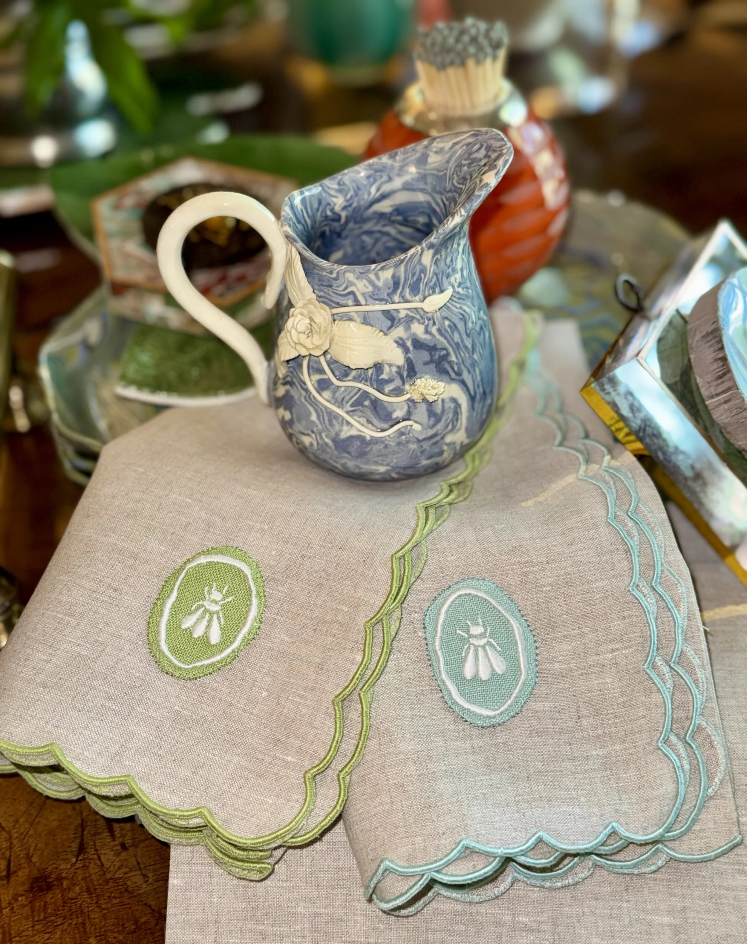 The linens are such beautiful quality. The set of 4 comes with a green, aqua, coral and pink napkin. The scalloped edges are charm central with the coordinating cameo bee. You can read more about them and shop here!