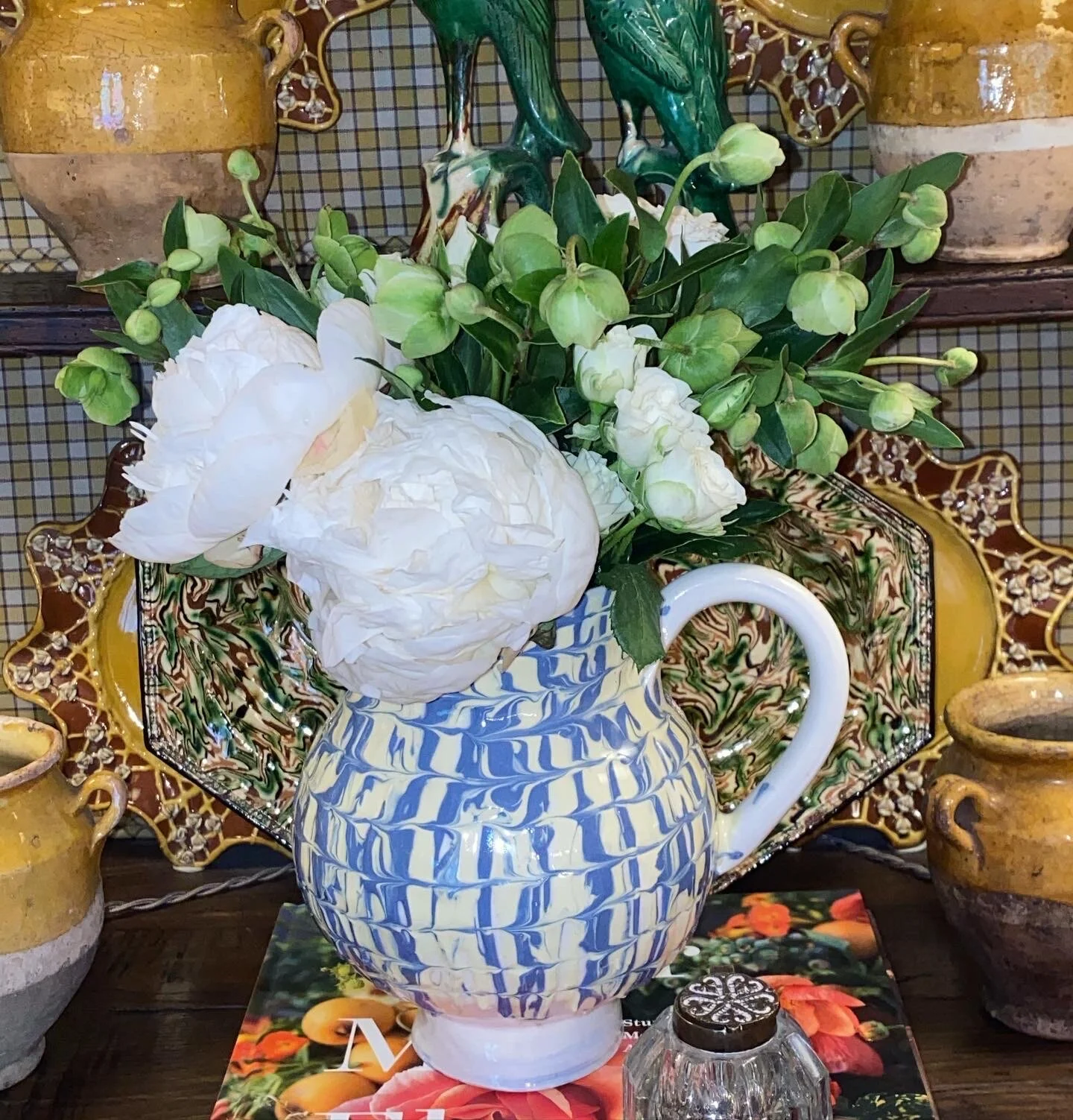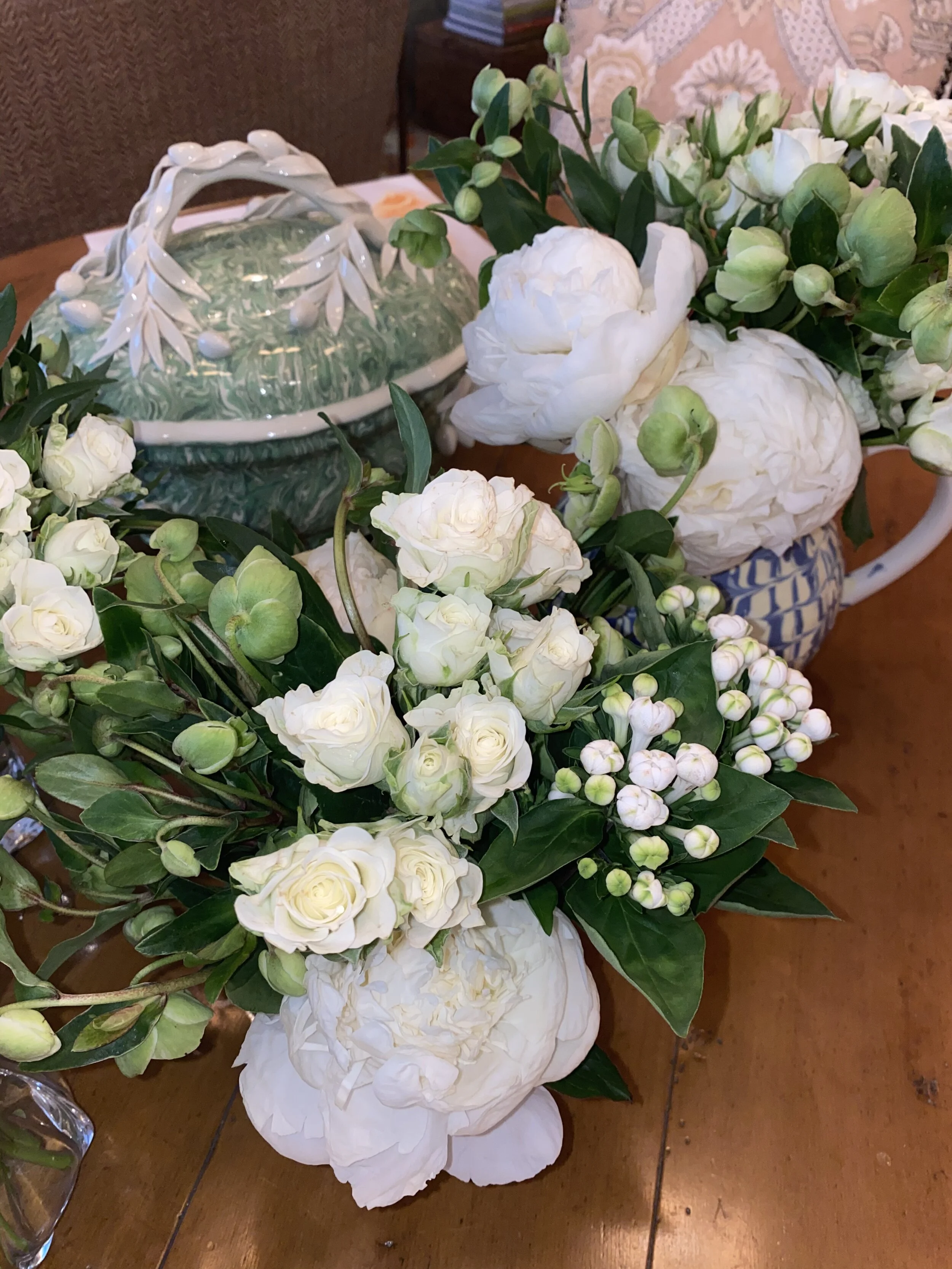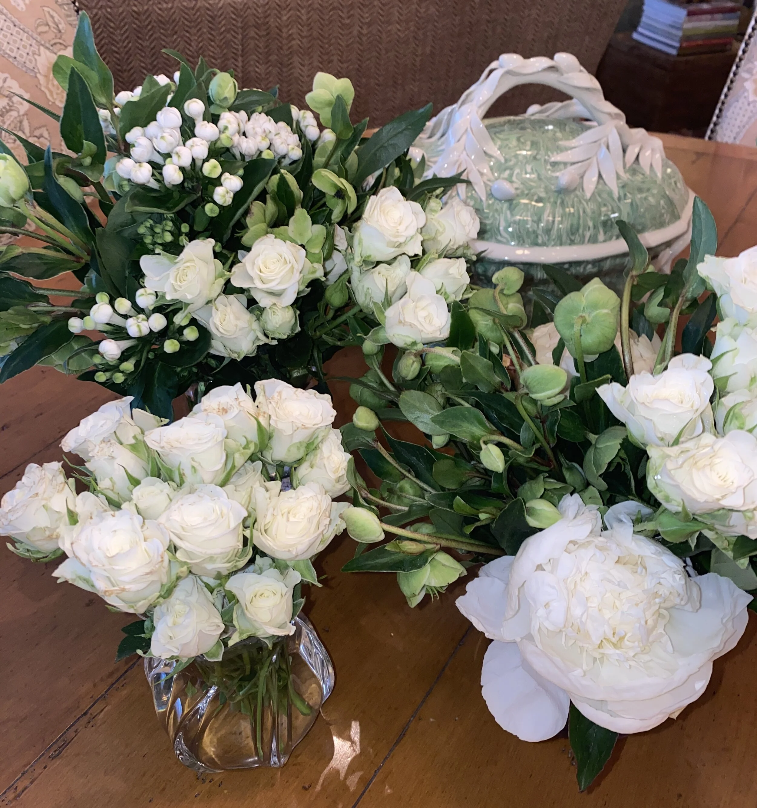 With all white flowers, I had more flexibility choosing containers. I did a collection of clear crystal vases, and then some other vases with color ~ five arrangements in all.
