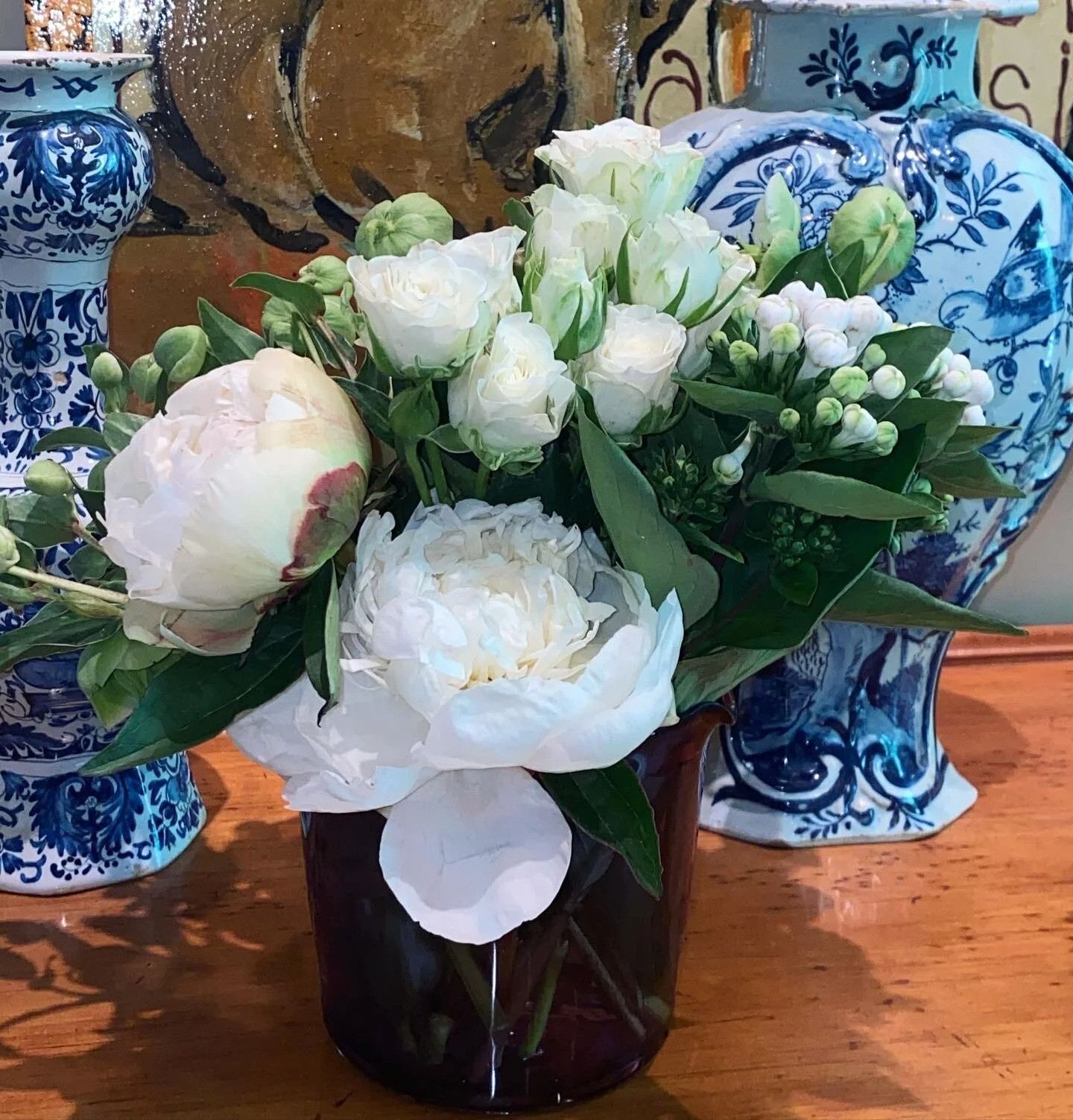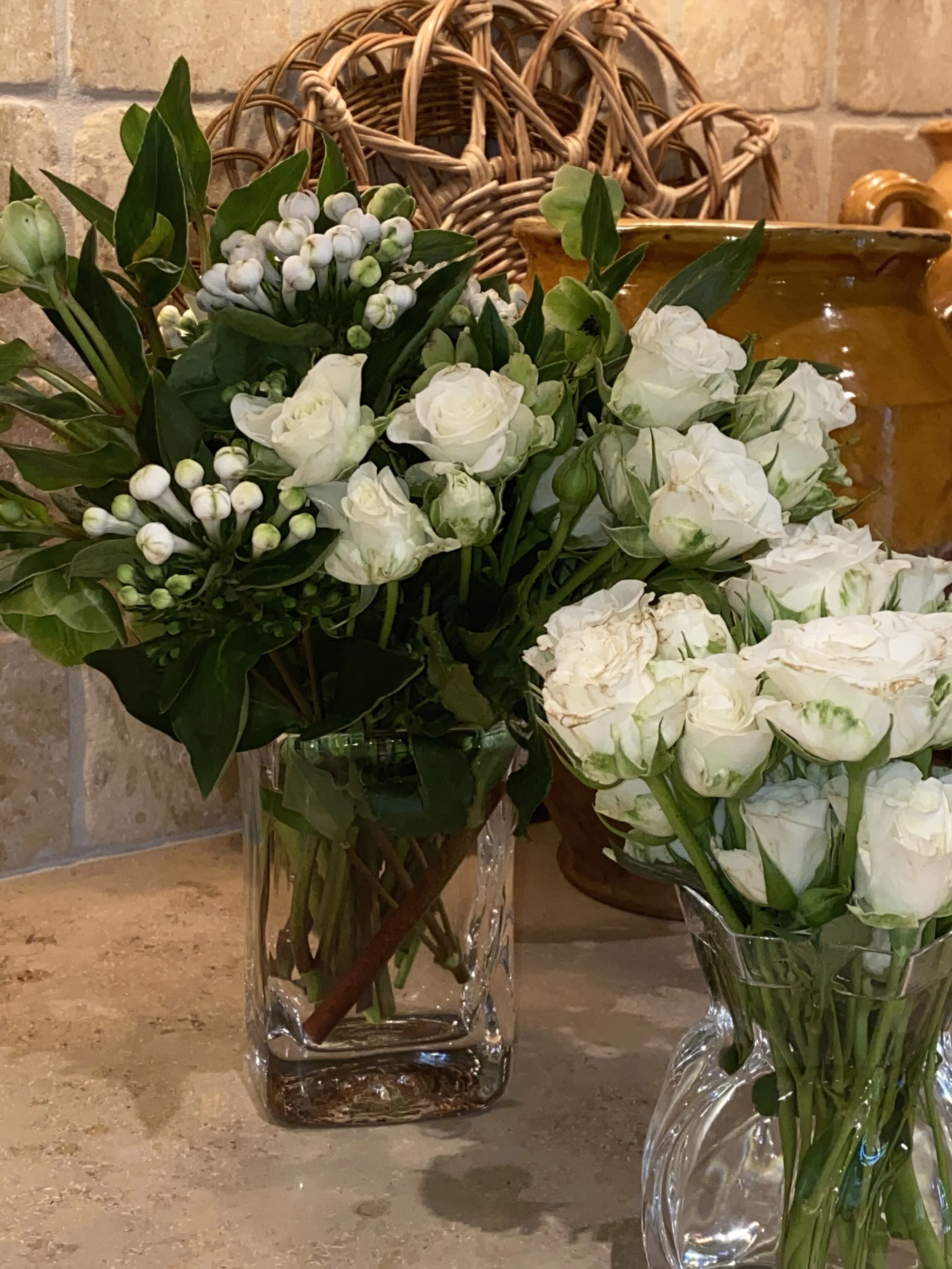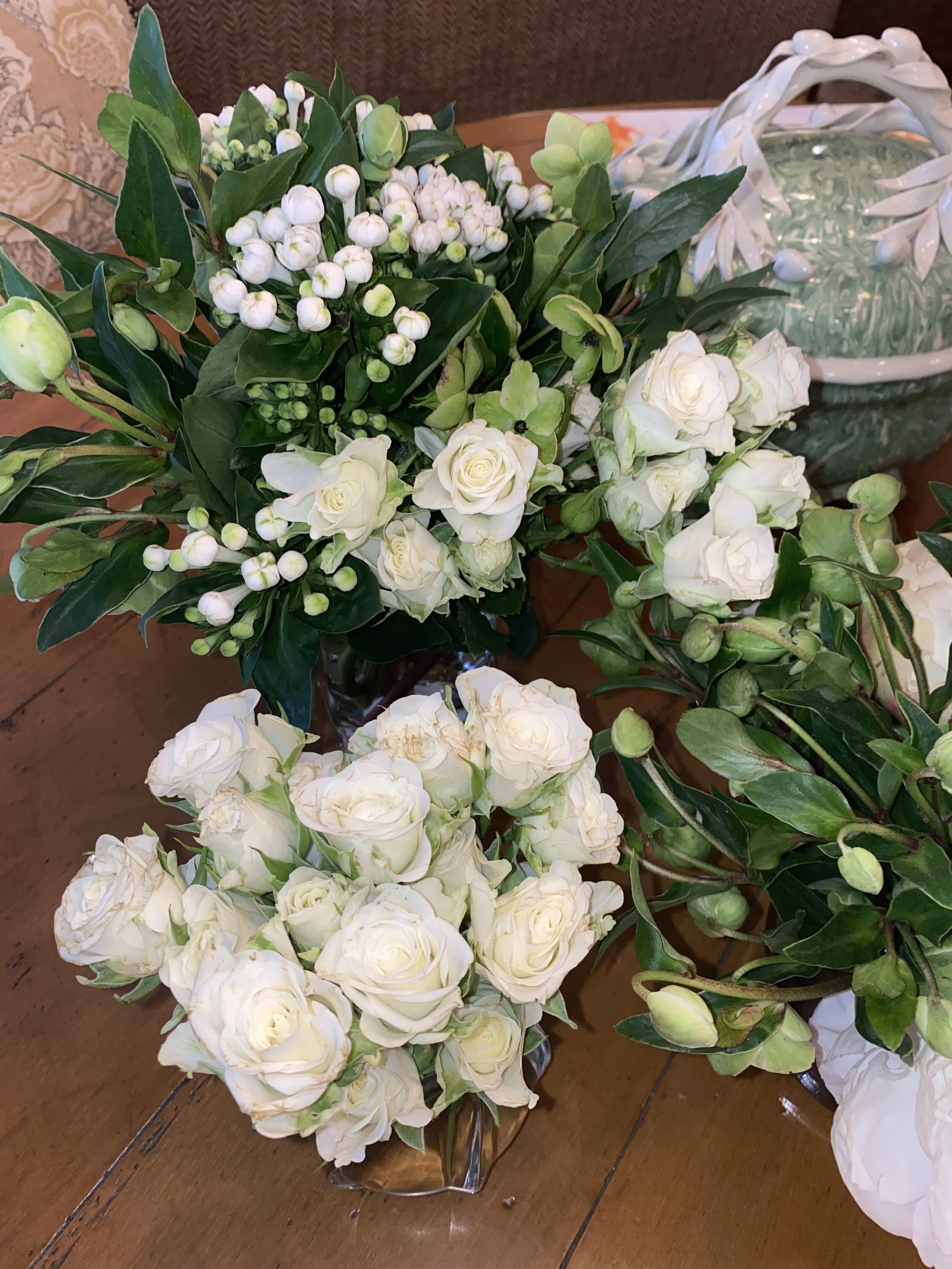Most of the white peonies were still closed pretty tight, so I used them sparingly in the arrangements. I will enjoy watching those open up over the next week or so. I had a few spray roses left at the end, and rather than stuff more of them in the arrangements I had done, I put them in a separate small vase.