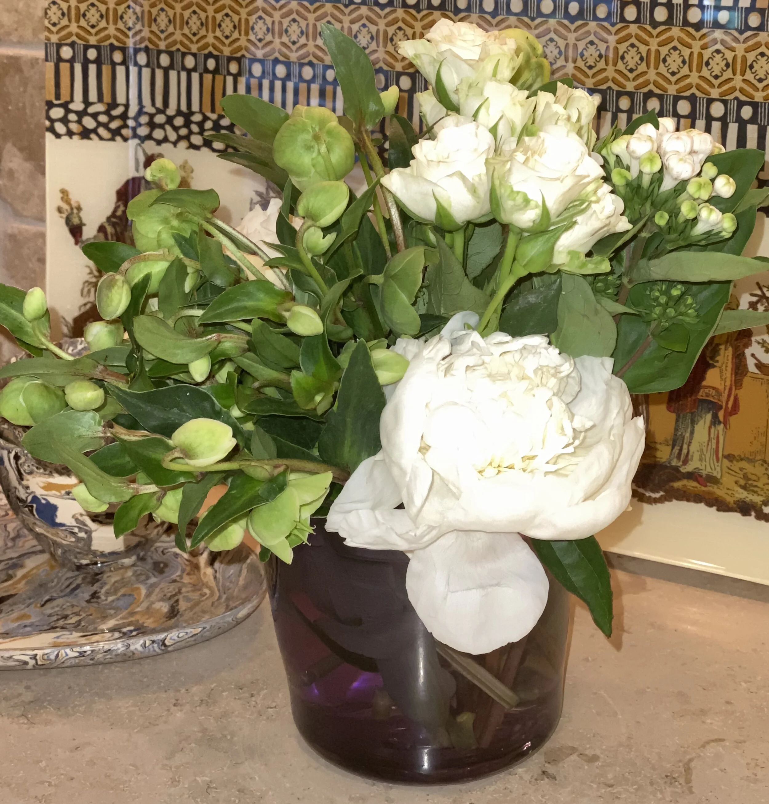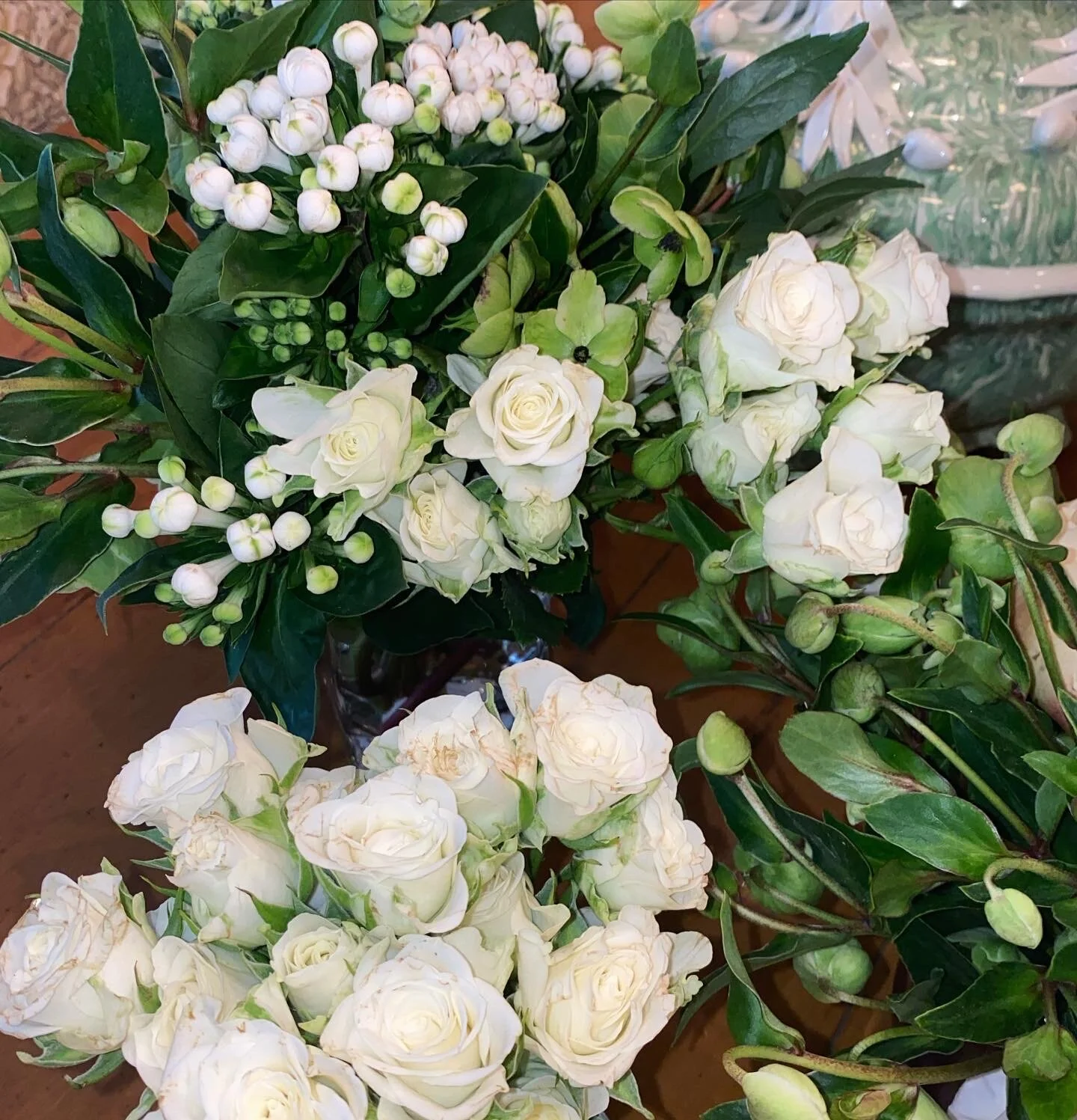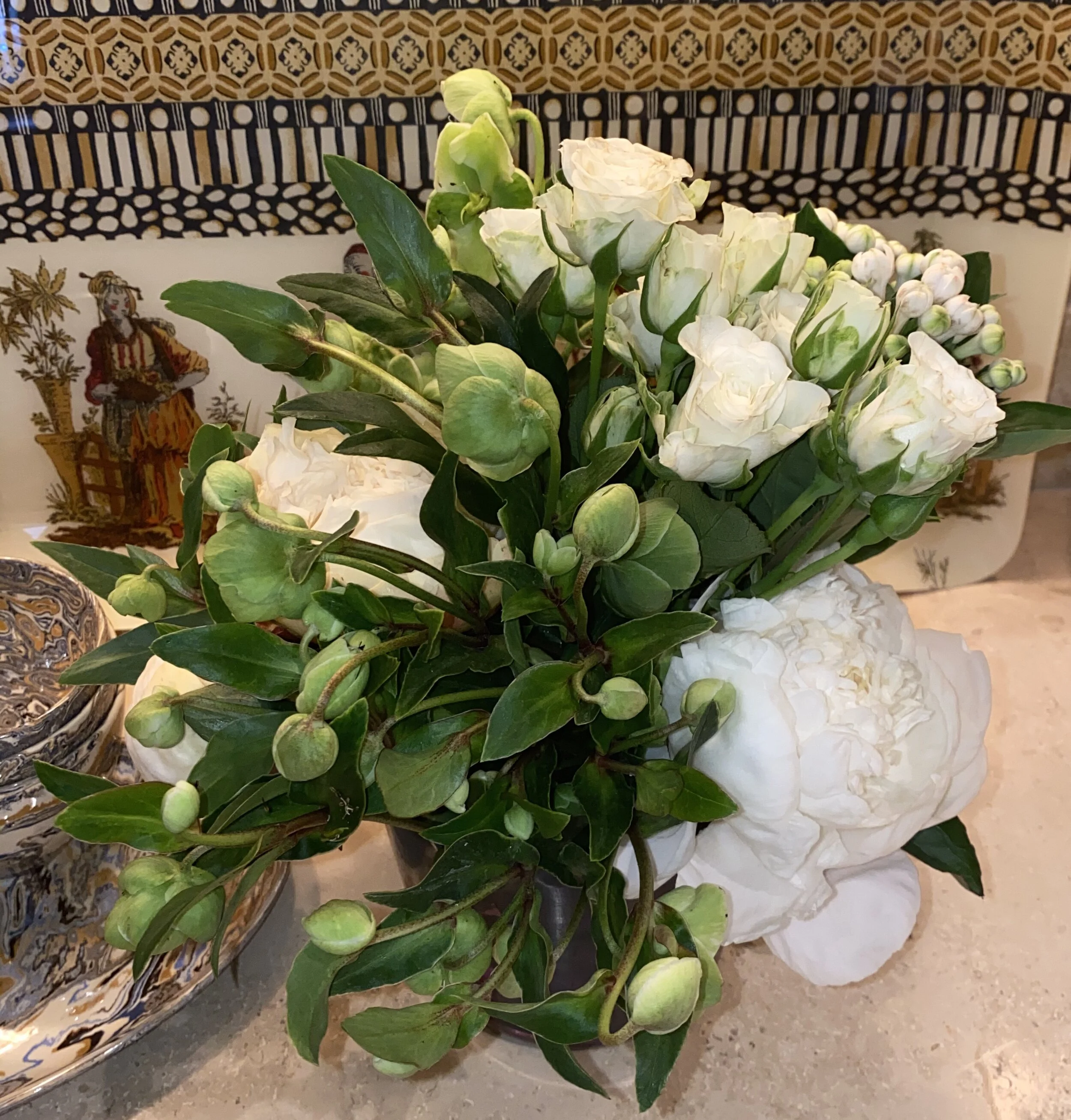 Most of the white peonies were still closed pretty tight, so I used them sparingly in the arrangements. I will enjoy watching those open up over the next week or so. I had a few spray roses left at the end, and rather than stuff more of them in the arrangements I had done, I put them in a separate small vase.