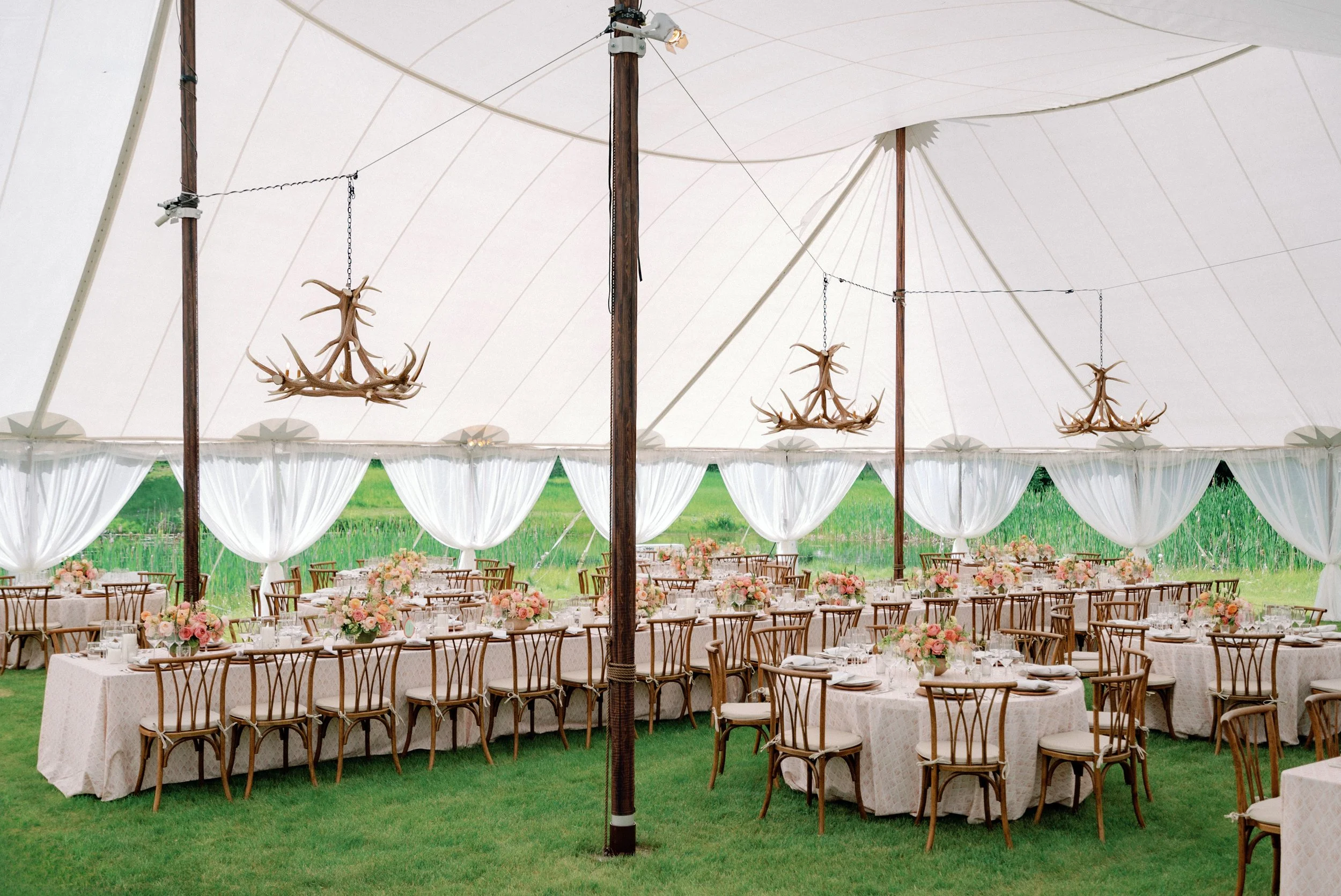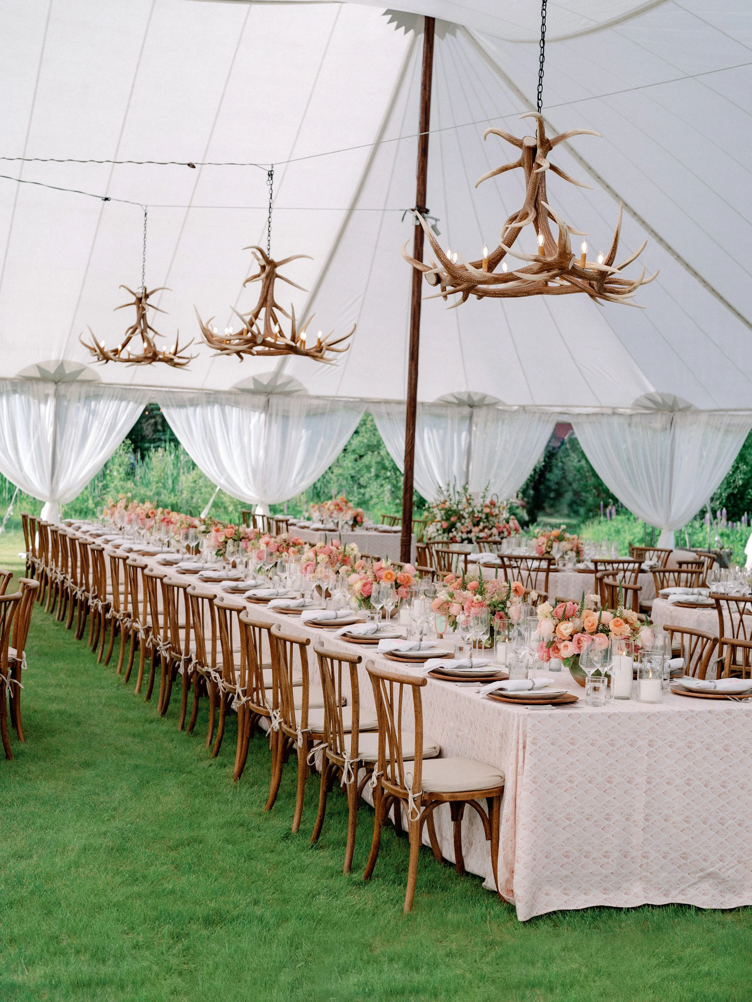 My inspo photo became an arch of spirea. I even had a photo saved of an arch made entirely of antlers! Considering the fact that pink was playing a larger role than originally planned in the reception tent, Hillary was especially loving the more natural and organic look, sans pink, for the ceremony.