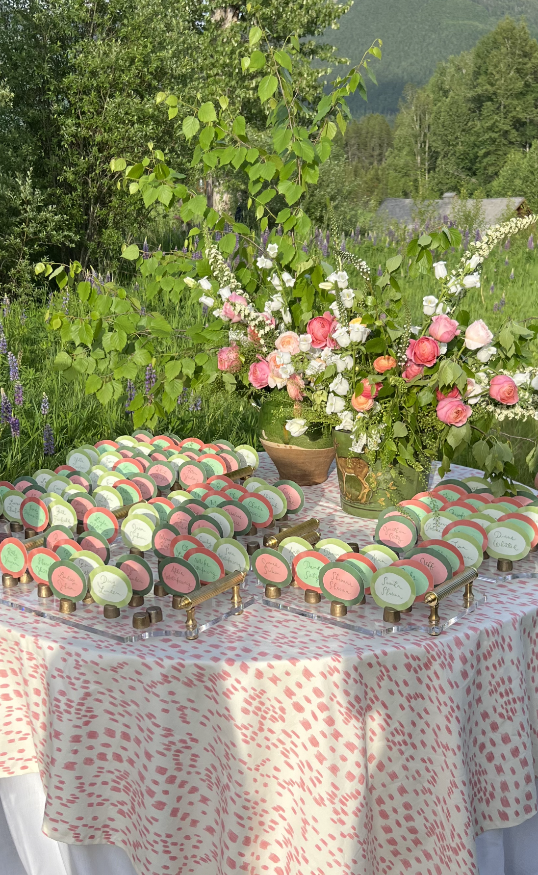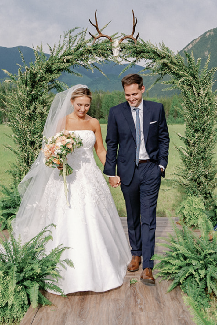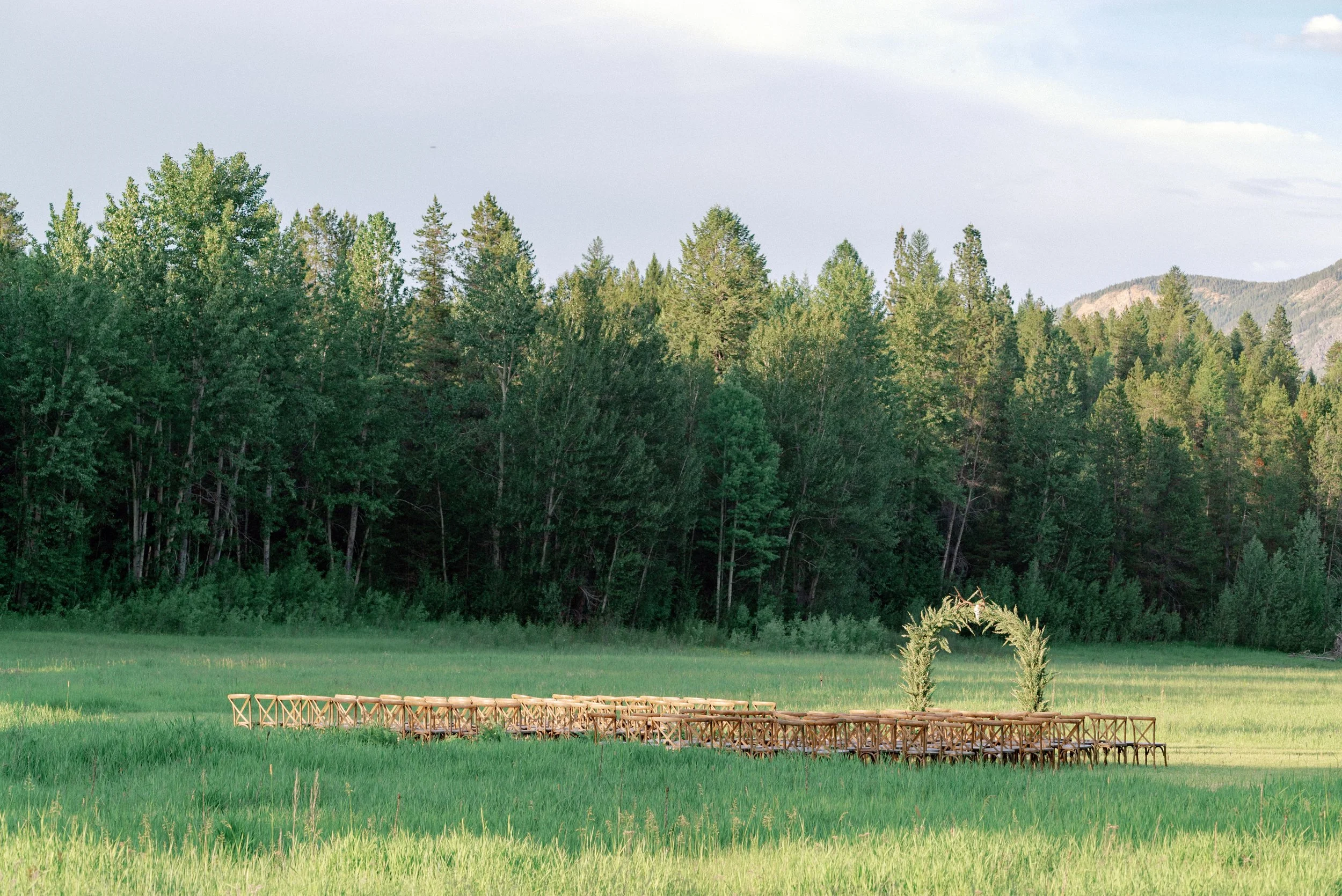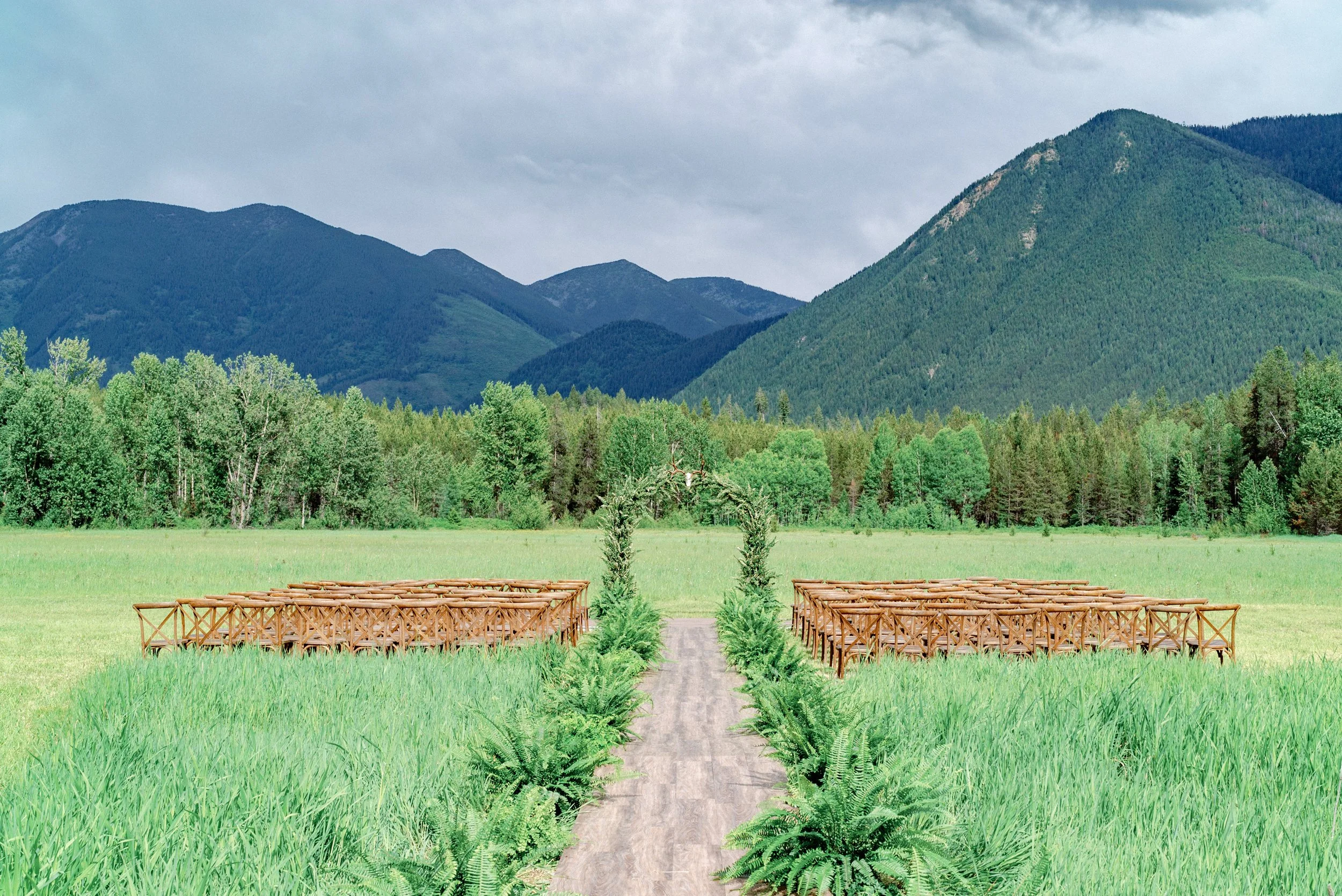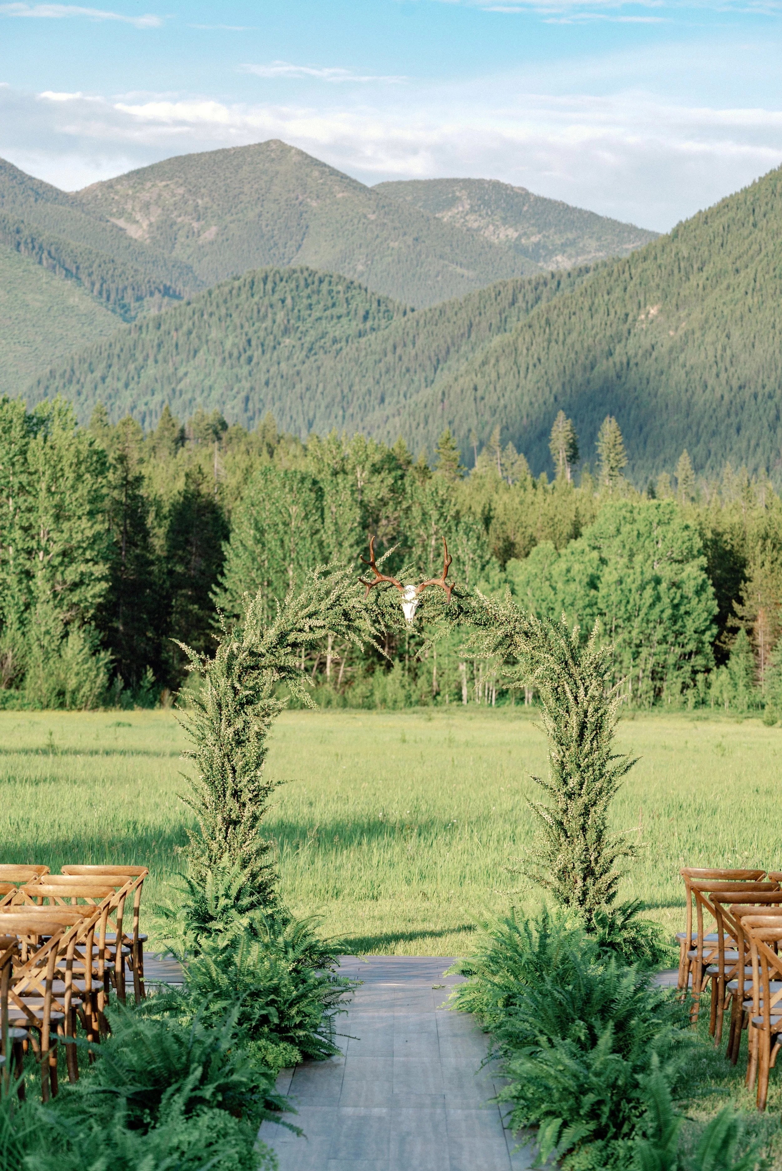 A wedding at Green Valley Ranch comes with the most magnificent scenery of the West Glacier mountains as a backdrop. As planning progressed, and we confirmed floral representation elsewhere, I became less concerned with the big floral arch. After all, the ceremony would be all of 20 minutes. Plus, I loved the saturated greens everywhere, and the Ralph Lauren vibe was really speaking to me.