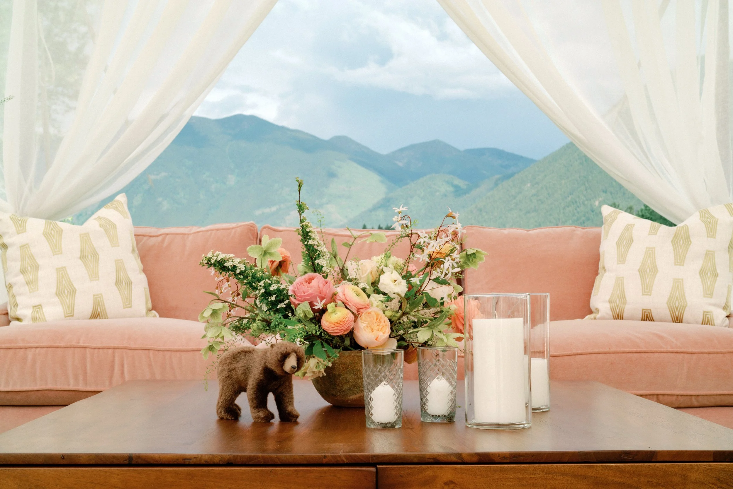 Here are some of the florals for the bars and the seating areas. Look at the backdrops through the openings behind the sofas. It looks like a backdrop for a scene in Yellowstone!
