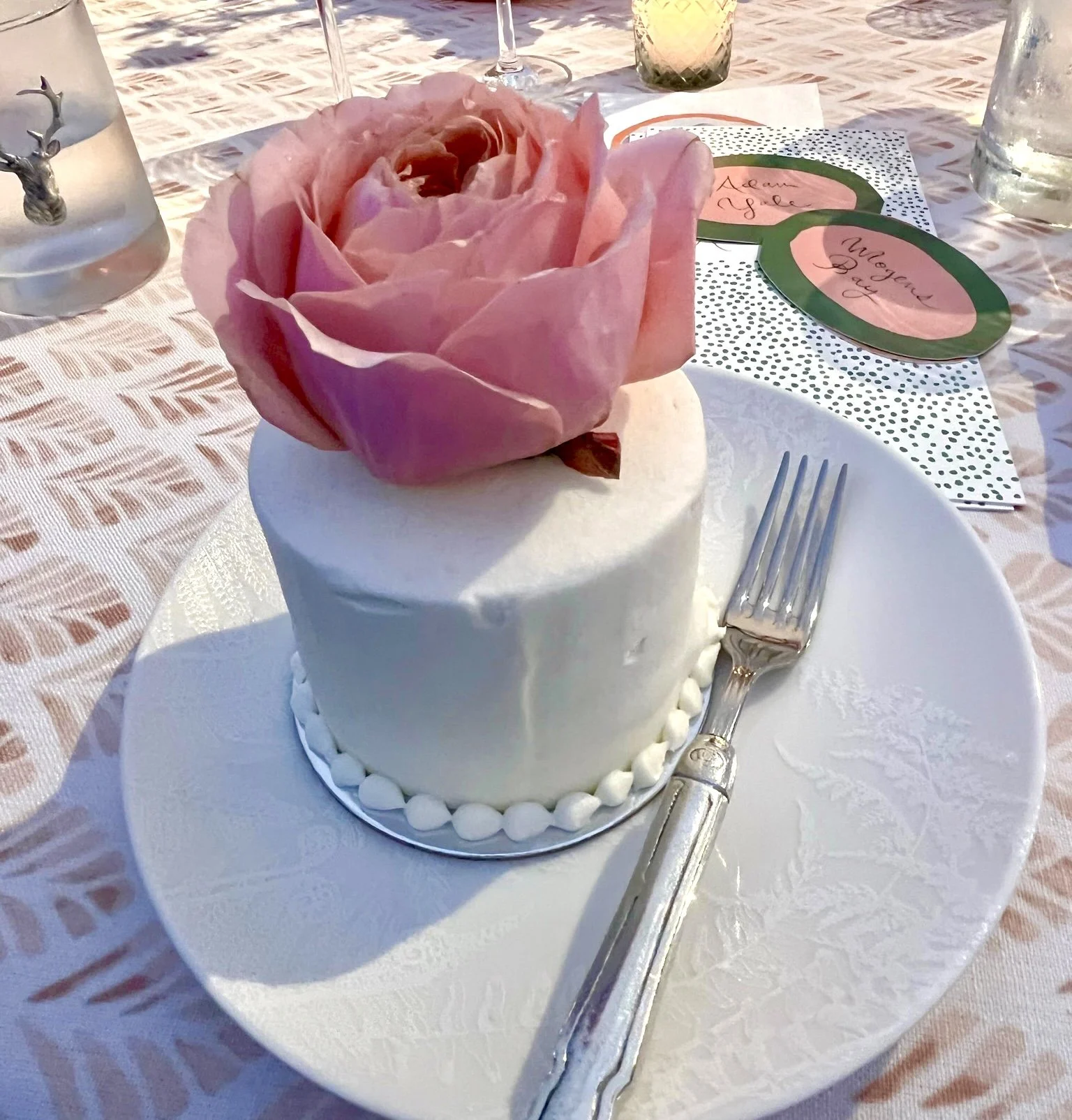 I had several photos of mini individual cakes saved in my wedding folder, and we either wanted a flower on each individual cake, or at each place setting. I worried that flowers laying at the place settings would appear wilted or just look like dead flowers pulled from the centerpiece, so I was relieved when we went with the flower mini cakes!