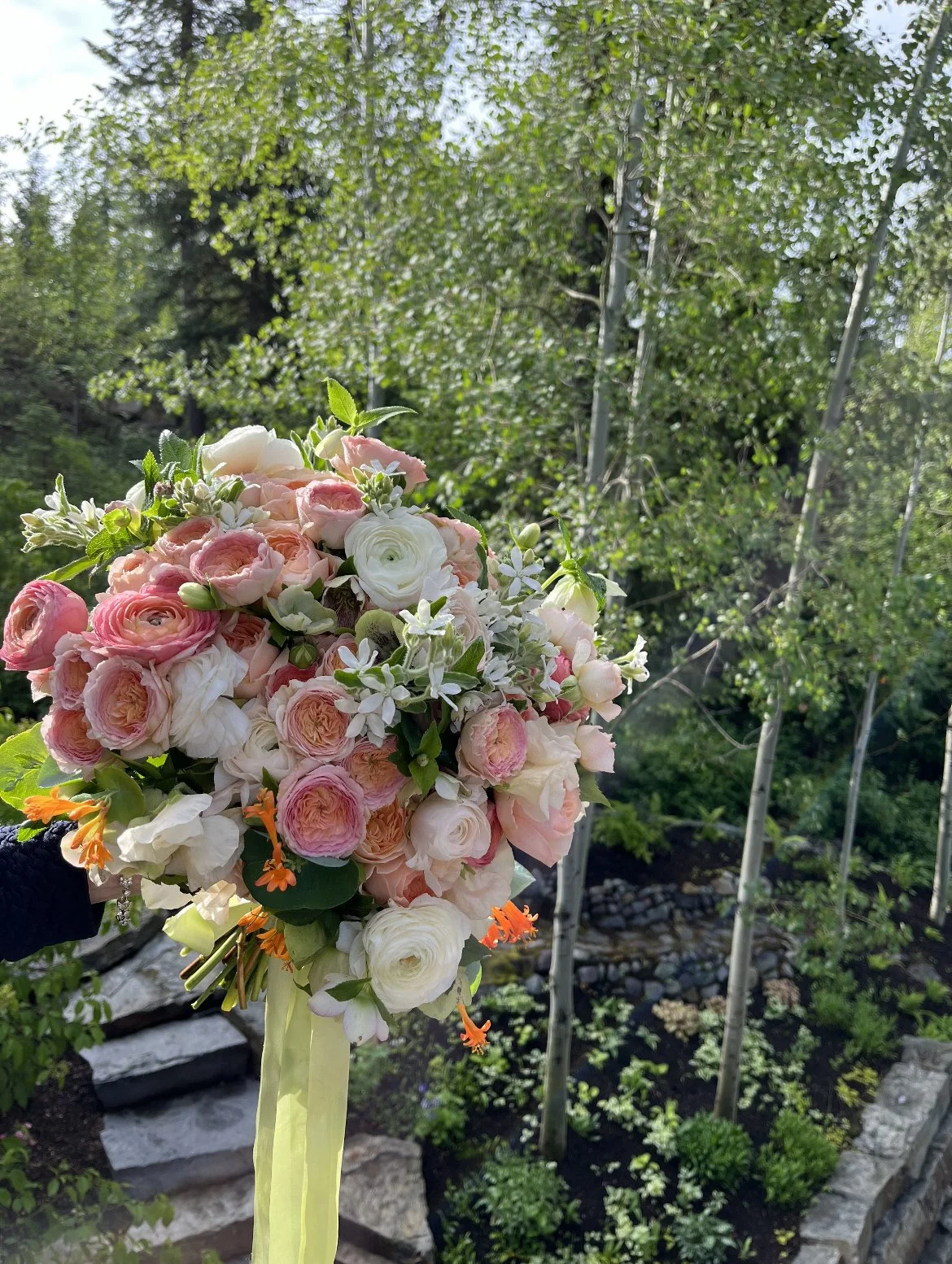 The next morning, I got this photo with a message saying she really wanted the orange honeysuckle from up in a tree at the house she was staying at, and our friend climbed up and got some to add.