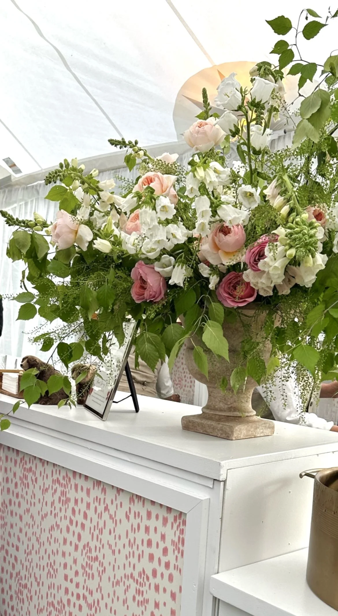 The white Canterbury bells were a hit. I think I had ten friends ask me what those were. They were everywhere, and so charming! Loved the height they provided for the arrangements with the branches of green leaves.