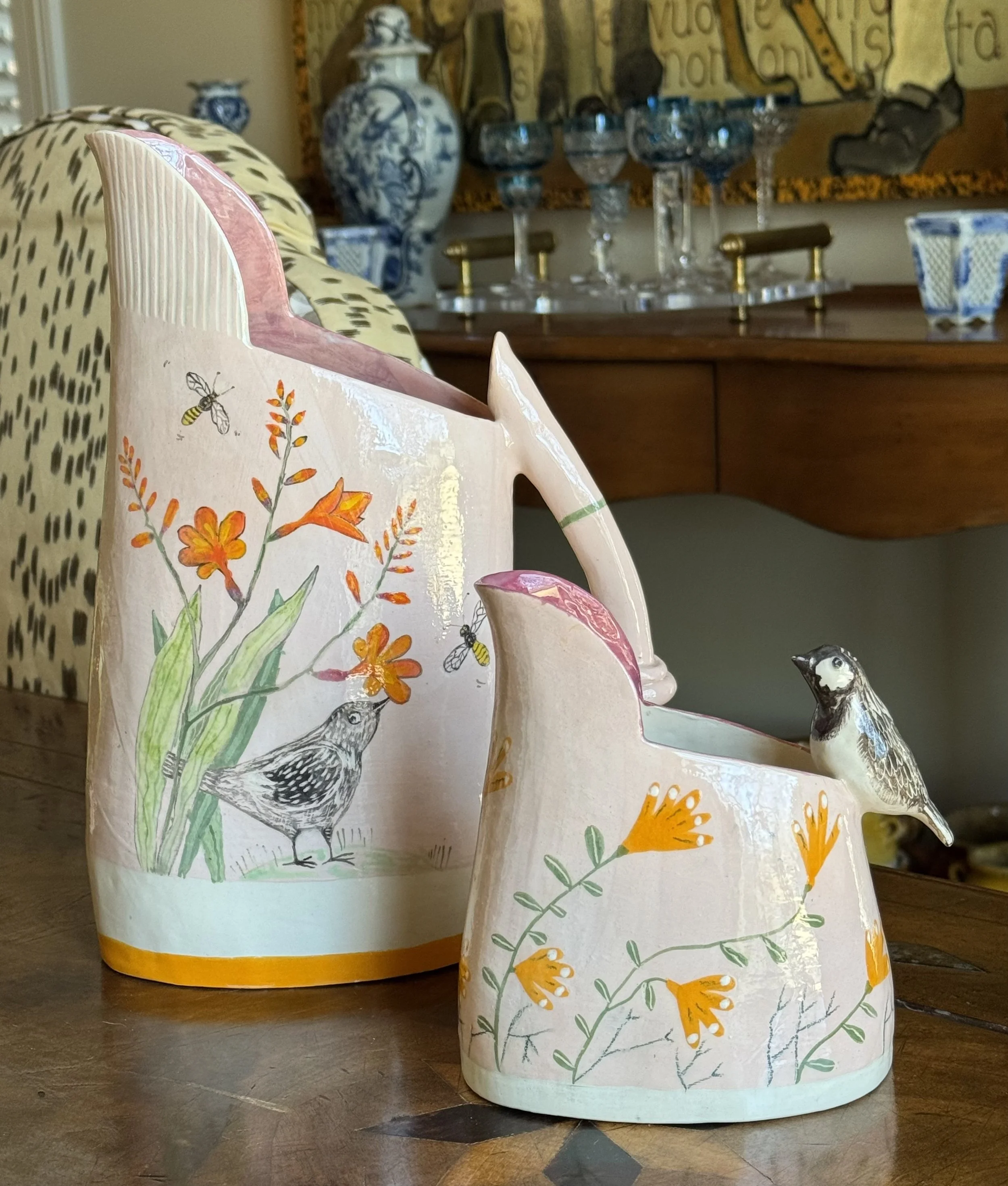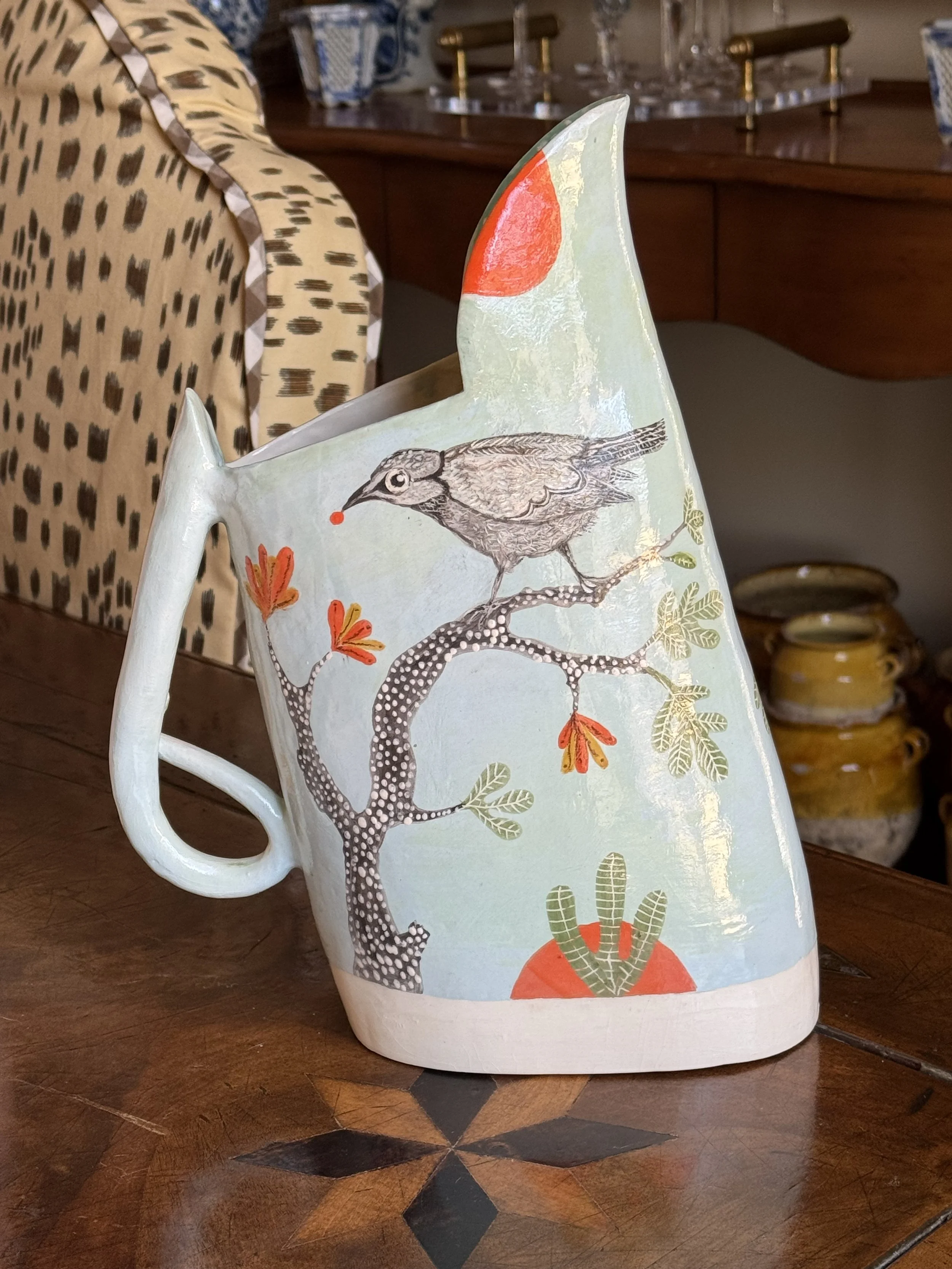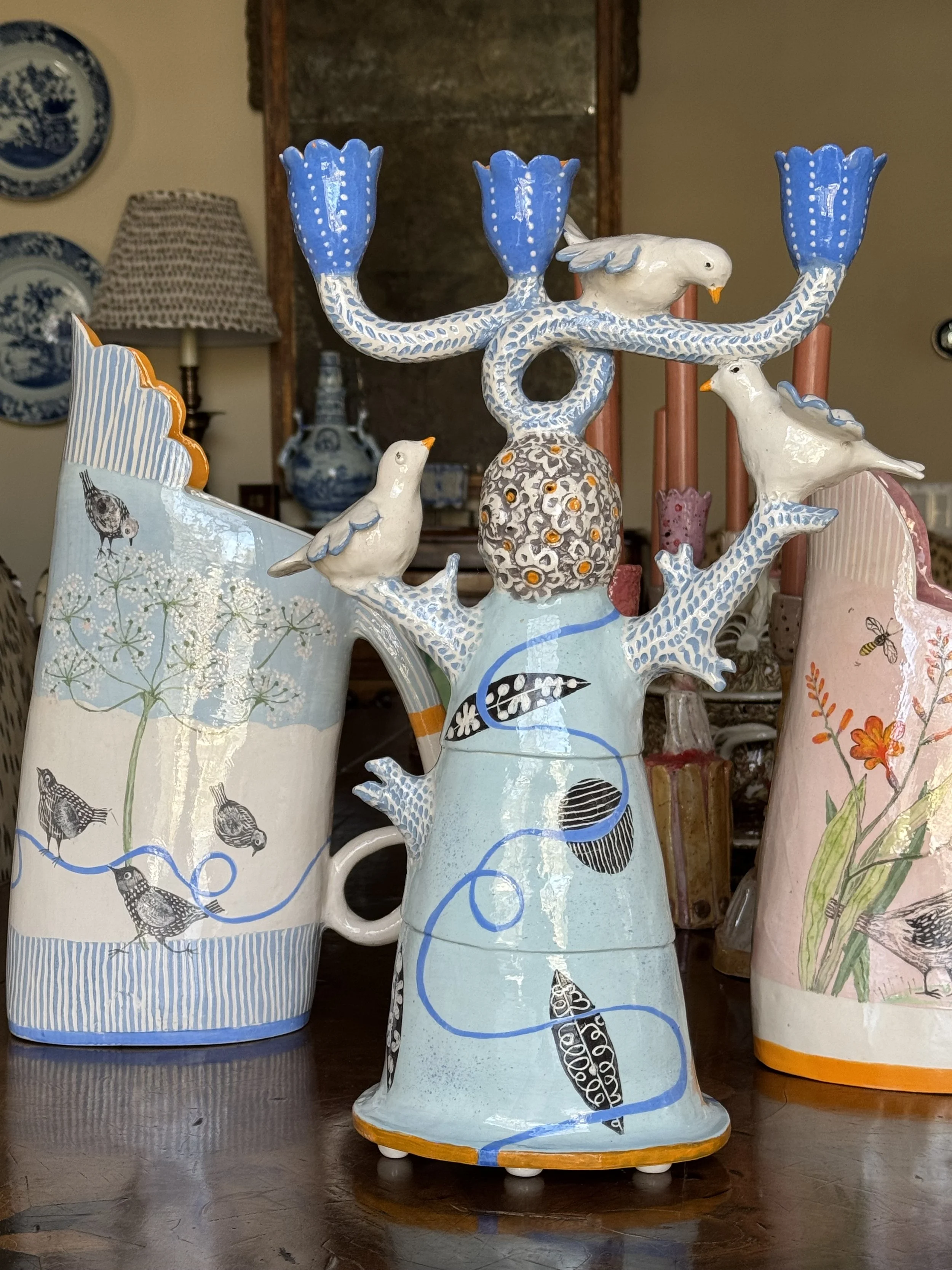 Laurance Simon is one of my favorite new artists in the shop. Her mastery of whimsical and quirky designs is impressive and her work is an absolute delight. Born in Paris, Laurance left to study in the UK, met her husband, and decided to make England her home. She has exhibited widely in France, Spain, Belgium and London and has numerous articles written about her work. She has a following, including me, who can’t wait to see her latest offerings. Her candelabras are especially special and I’m thrilled to have had several in the shop over the last year. These blue cups and precious birds on this newest piece are really wonderful! You can see a couple of her jugs here as well.