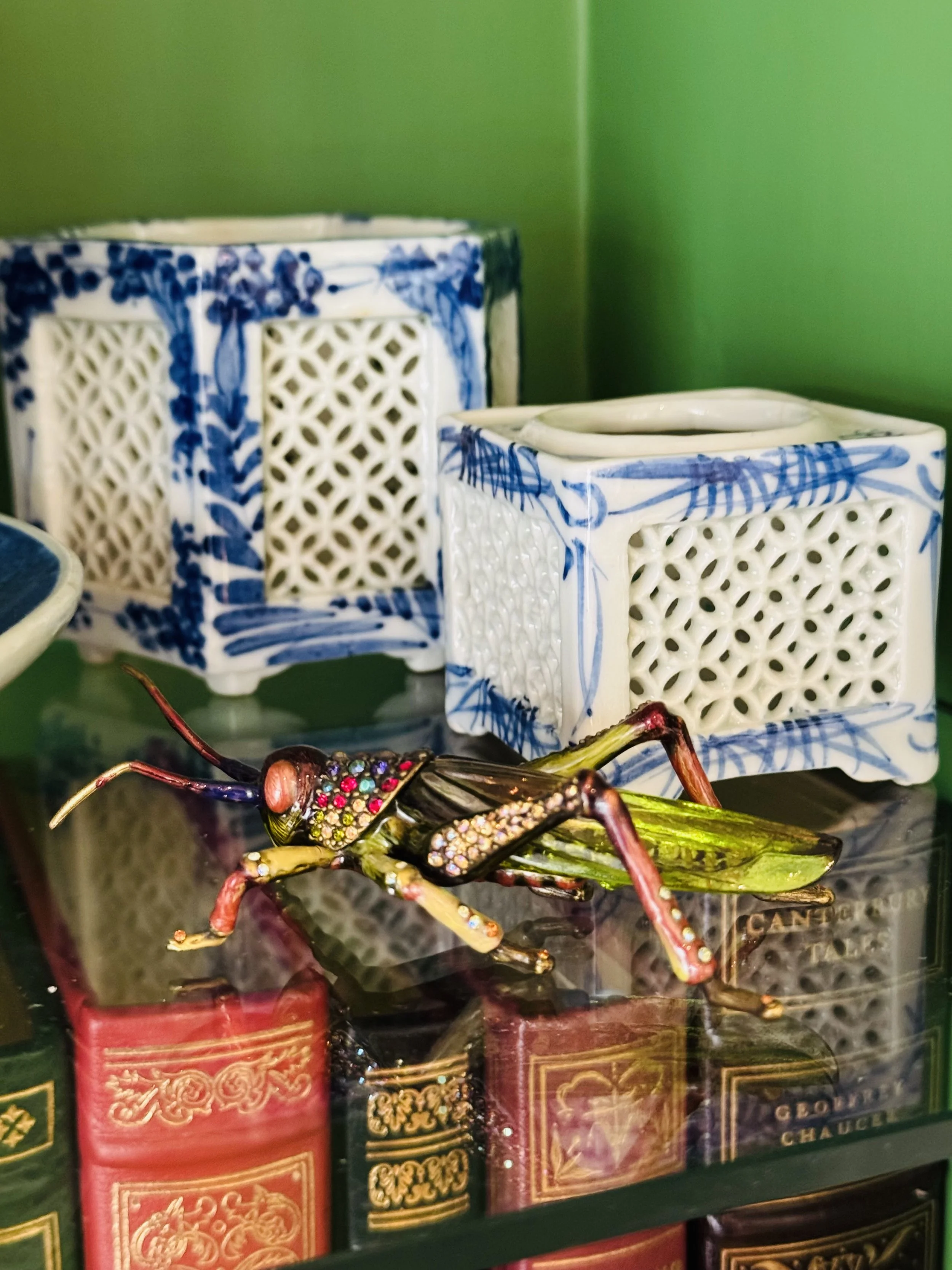 Here is a photo my dear friend sent me this morning featuring a Jay Strongwater cricket next to a couple of her cricket cages. She is so clever and I adore her and the cricket!