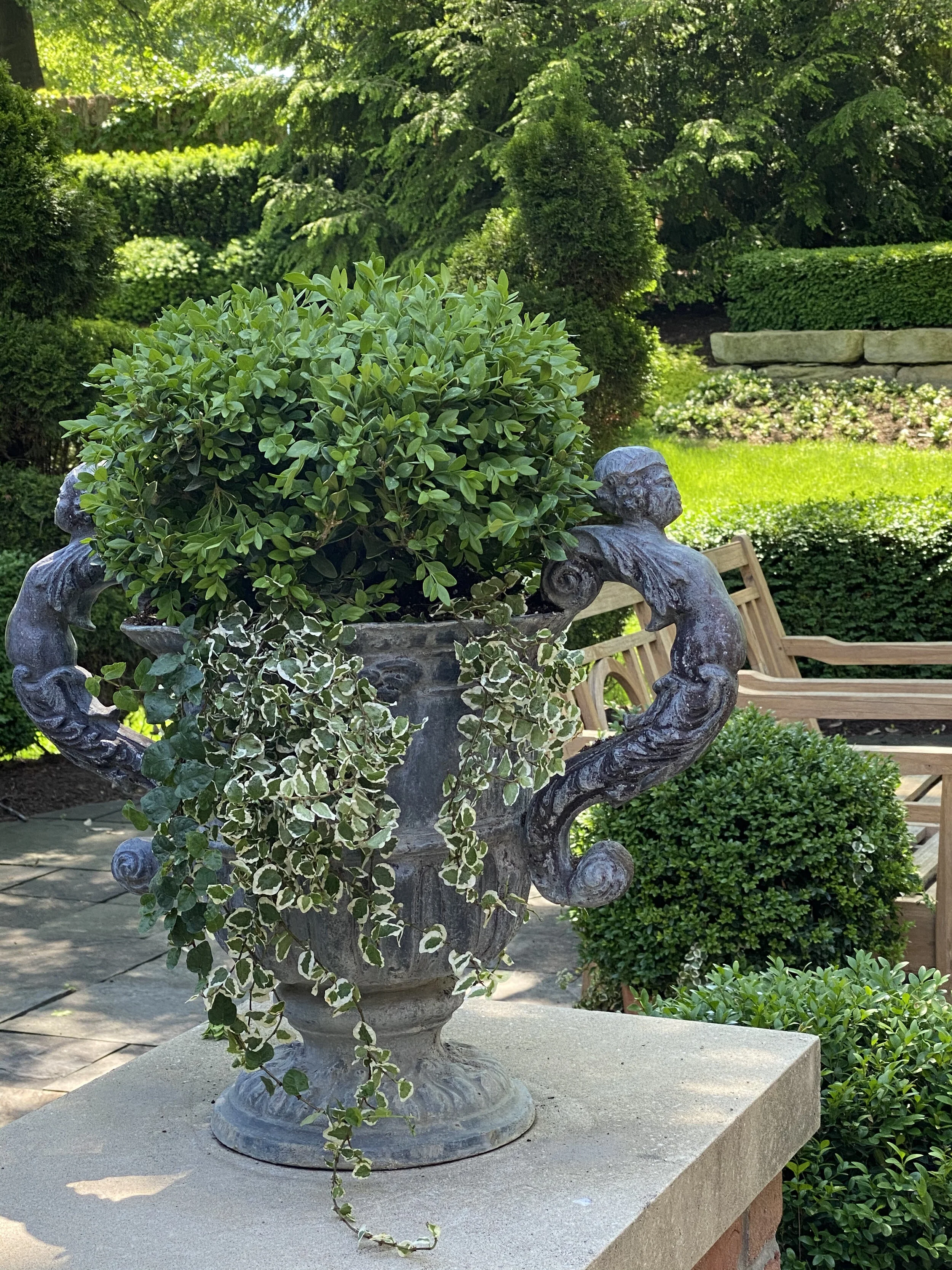 I just love those begonia leaves in all the colors and patterns. Here are a few shots of the containers around the house. Other than the rex begonia and the caladium, I mostly use boxwood. The triple topiaries are so sweet this year.