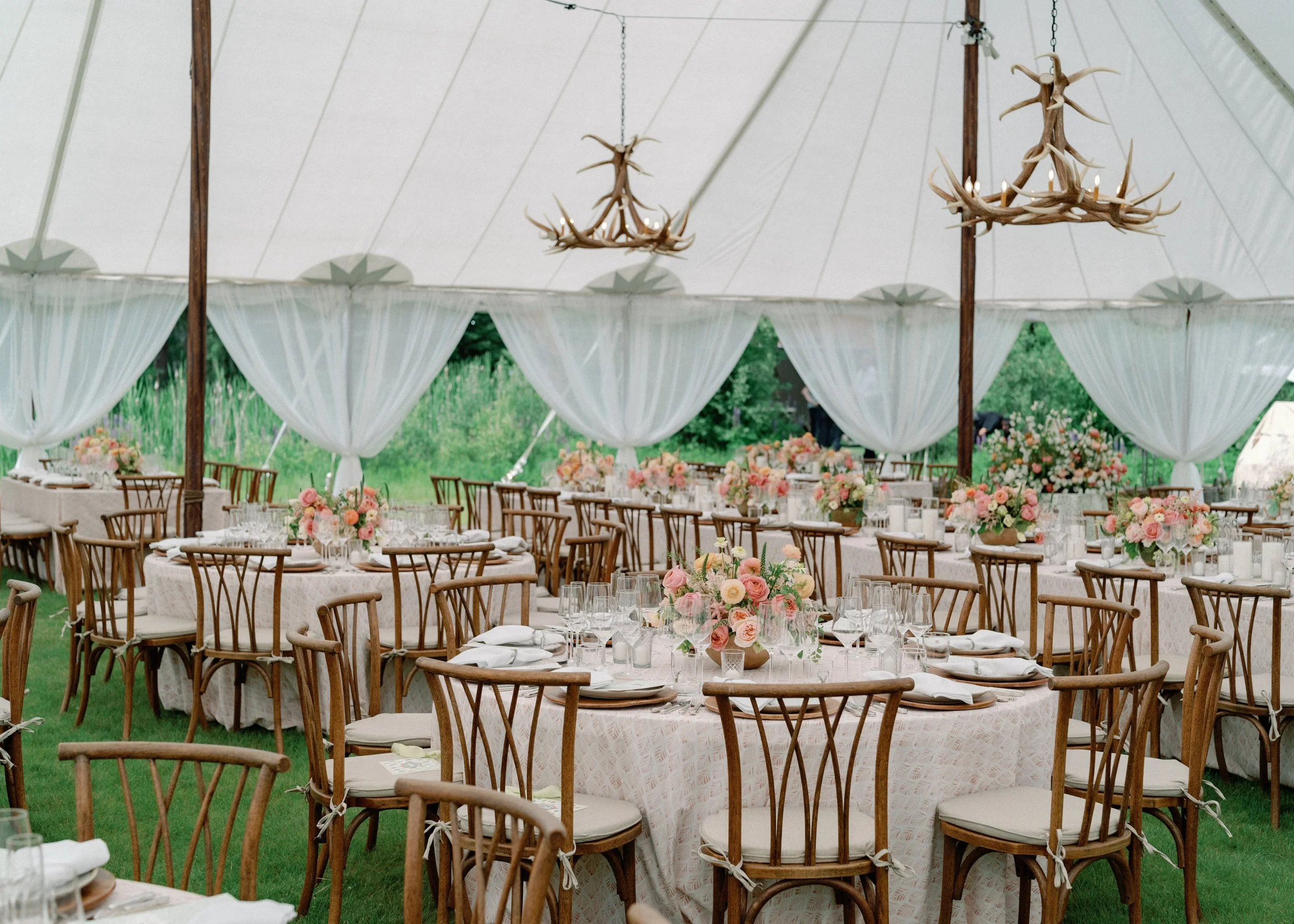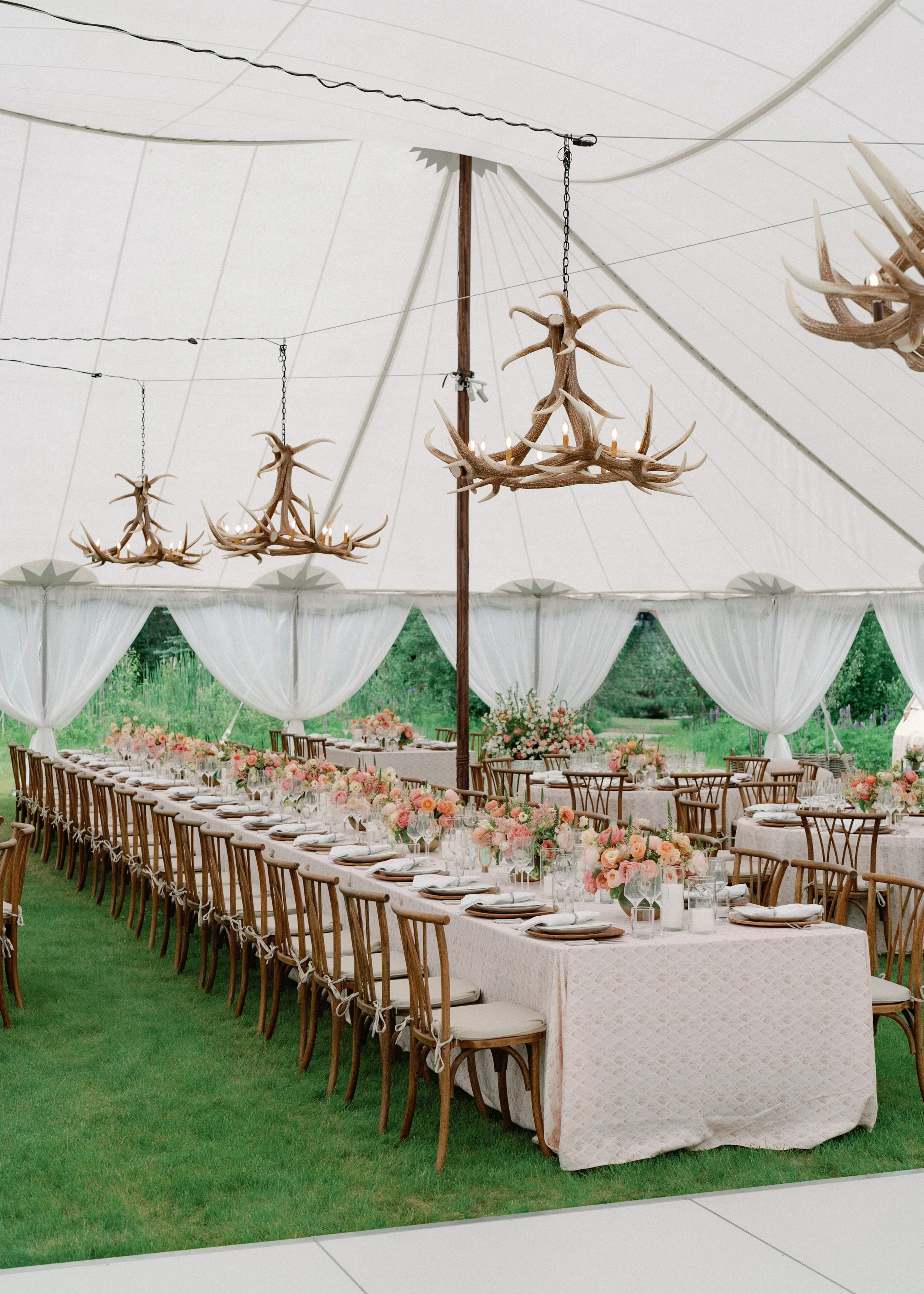 Inside the tent was absolutely charming. Loved the chairs, which were a new option, and the antler chandeliers were one of the first elements we designated for the “look and feel” of the wedding.