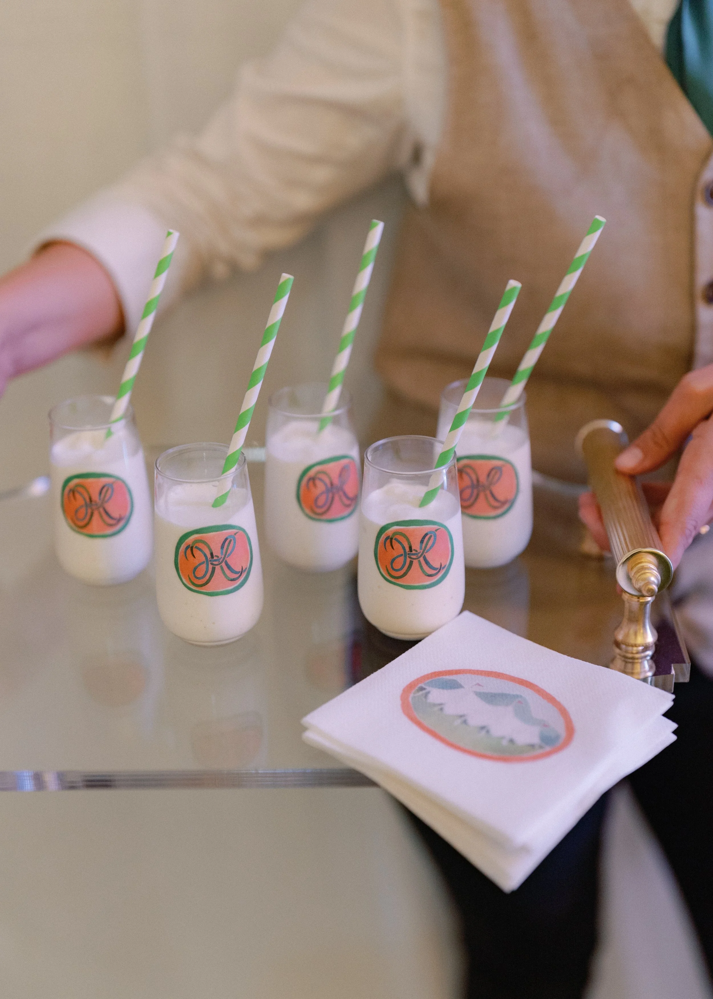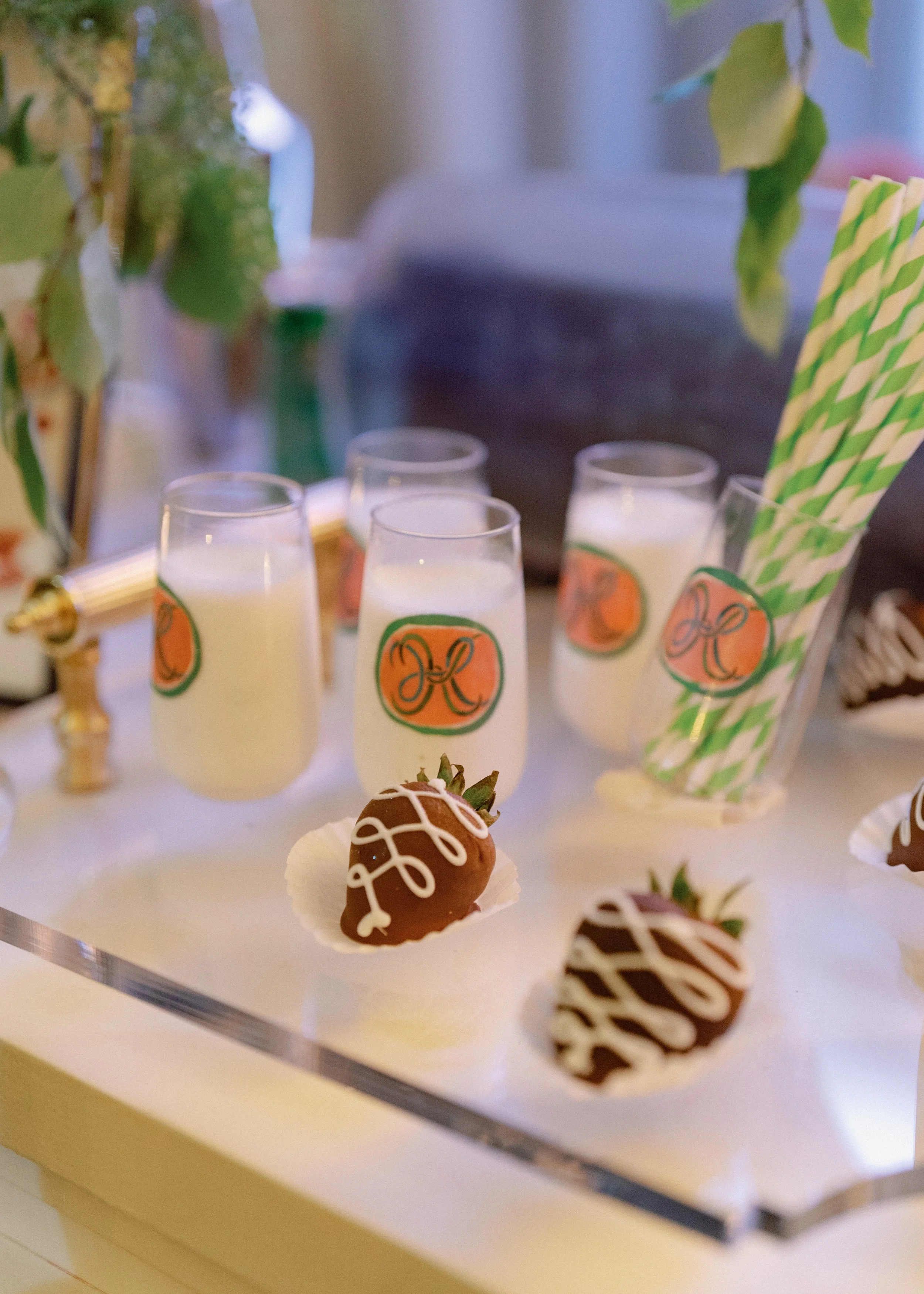 Mini milkshakes and chocolate covered strawberries were passed for late night guests.