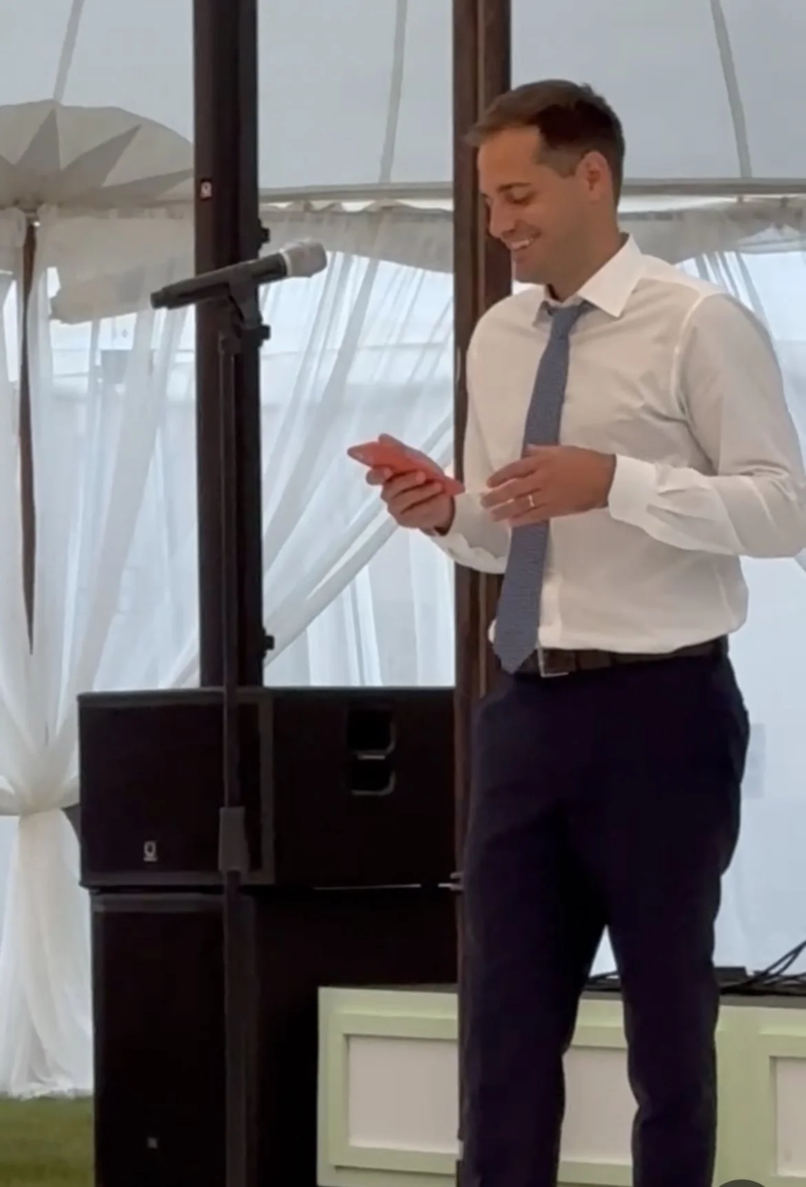 Nolan, another brother, was up next and had prepared what seemed to be a deeply moving speech, but he couldn’t quite get it delivered in the way, we have to assume, he had intended. Eventually, Keenan saved the day and the band was back in business, mini cakes were delivered, the wedding cake was cut, and dancing resumed.