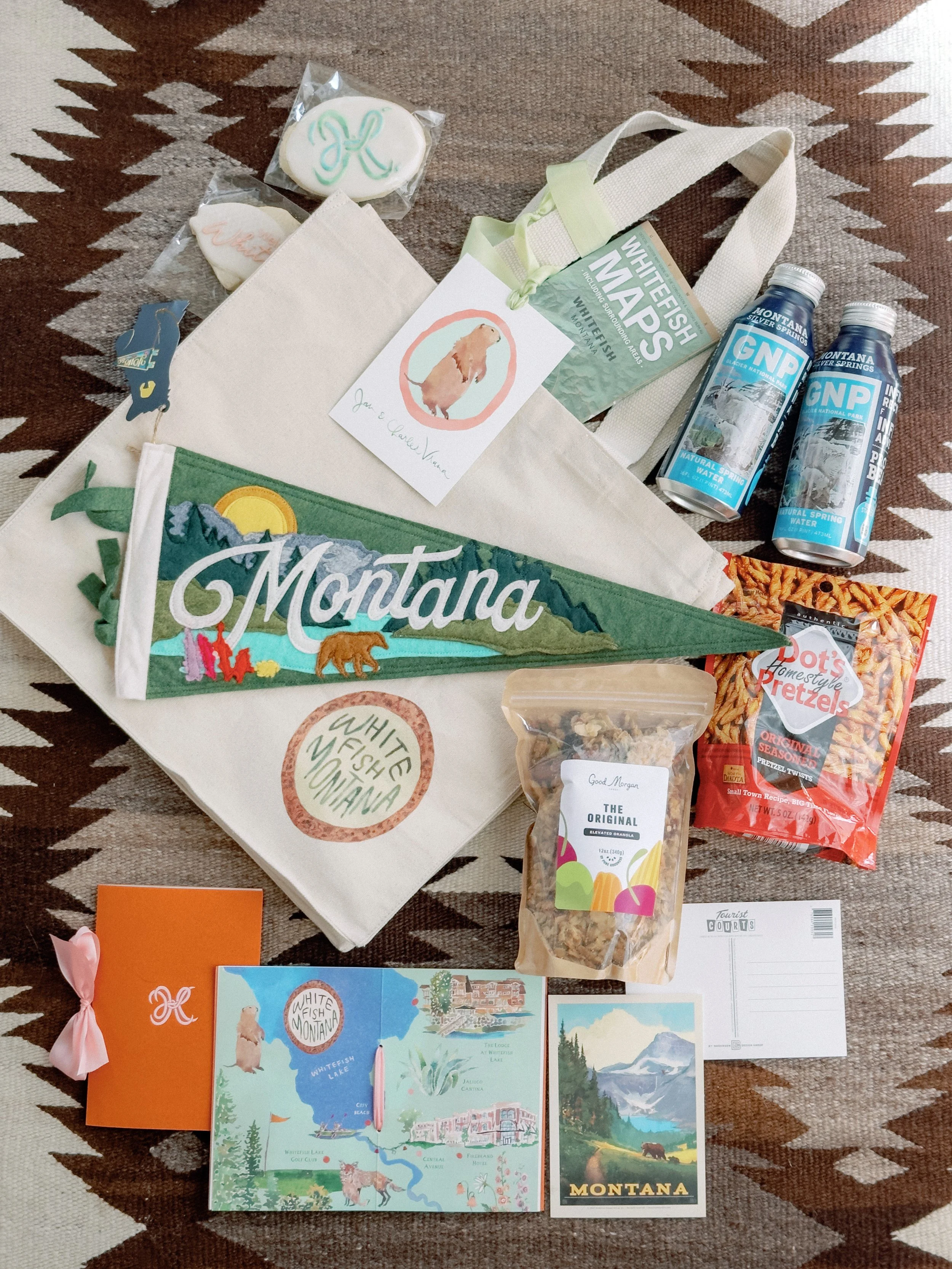 Upon arrival, as I’ve already shared, guests were presented with a welcome bag of goodies to kick off the weekend. We had so much fun putting these together! As far as food, we thought the granola was a good fit for Montana, plus the personalized cookies for something sweet and pretzels for a salty snack. The pennants were custom and we spent a fair amount of time planning and designing these for a special take-home gift. We felt the canvas bags with the custom Happy Menocal oval emblem would be a fun remembrance and would surely be used - that weekend, and at home. We added a postcard, a map, and a couple GNP waters for good measure, and of course, the welcome book! Happy’s artwork highlighted a welcome message, the weekend activities, plus lots of information and suggestions on what to do in Whitefish. .. Another fun keepsake.